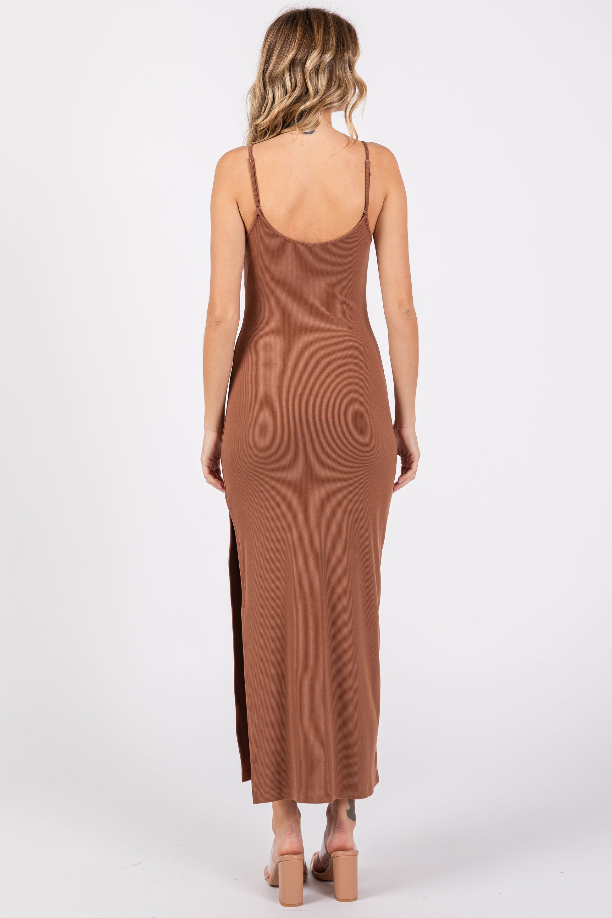 Camel Ribbed Sleeveless Side Slit Dress