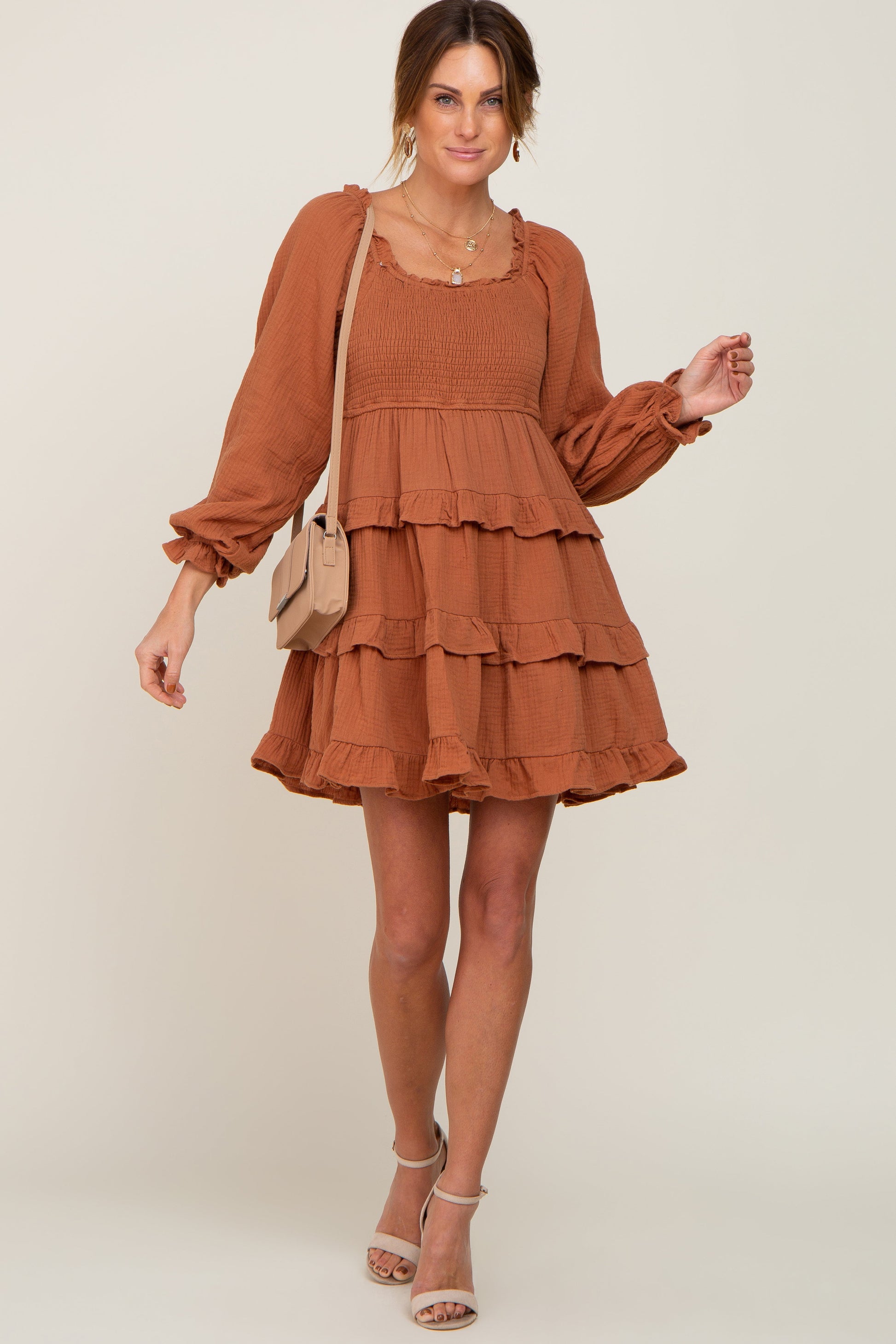 Camel Smocked Ruffle Tiered Long Sleeve Dress