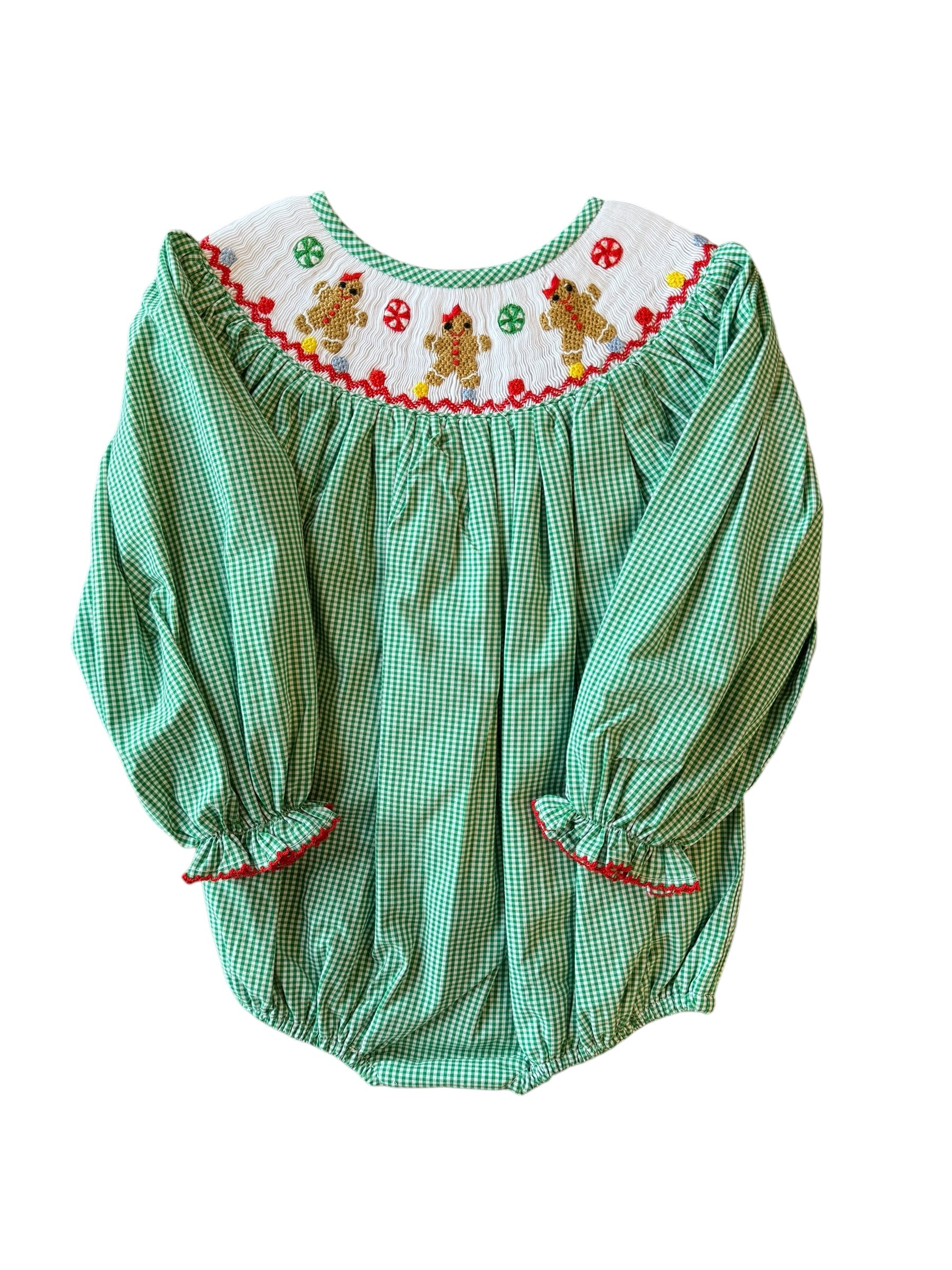 Sweet as sugar, the Candy Cane Lane Josie Bubble is a must-have for baby girls this holiday season. Available at The Prissy Pelican Boutique in Bossier City, LA, this long-sleeve bishop bubble features hand-smocked gingerbread friends and peppermint candies across the neckline. Made from classic green gingham with red ric-rac trim, it’s perfect for Christmas photos, church services, and holiday parties across Louisiana and beyond.