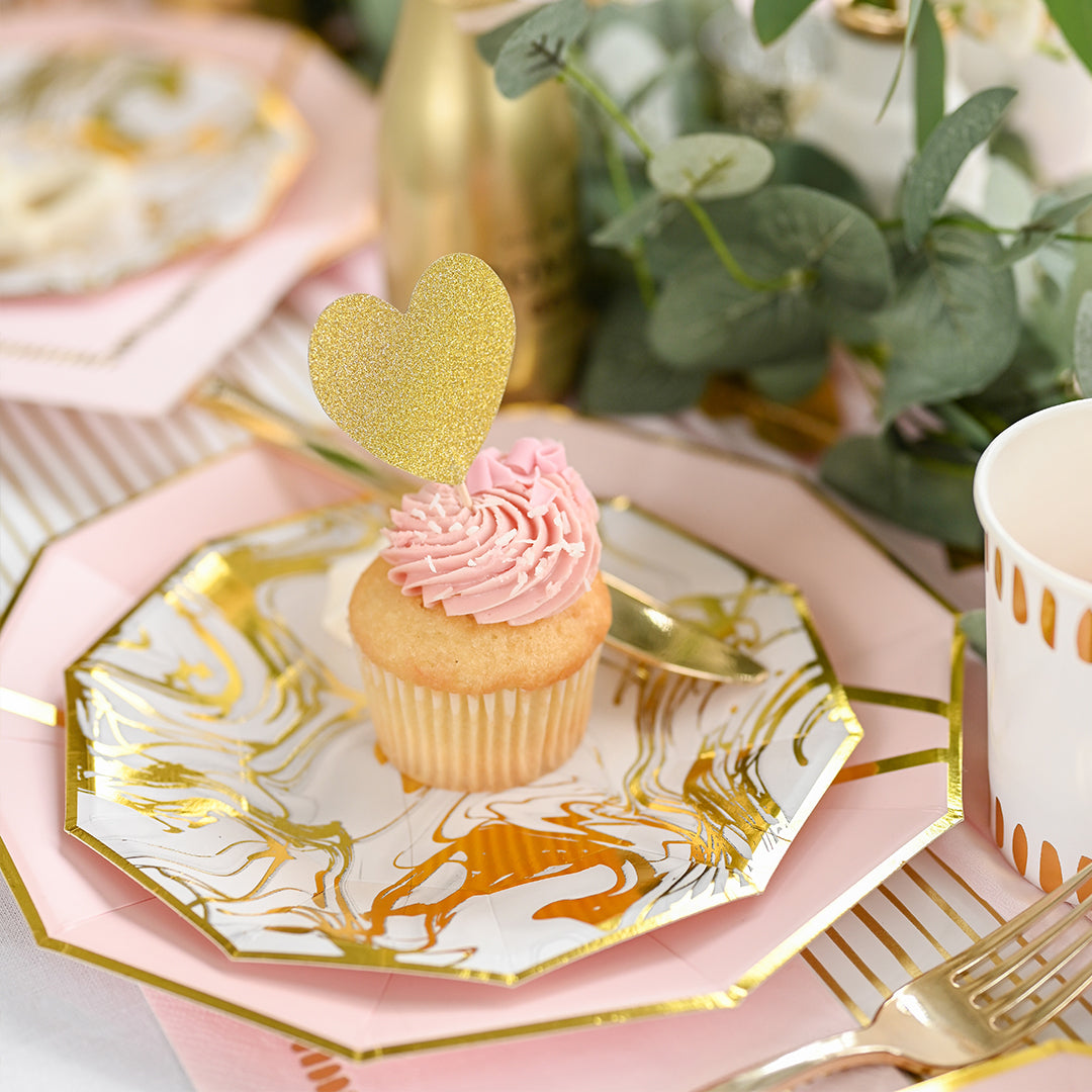 These plates feature a marble swirl so luscious and glossy, you might need to touch them just to be sure the ink has dried. The shiny gold finish adds a modern and elegant touch. Includes 10 plates.