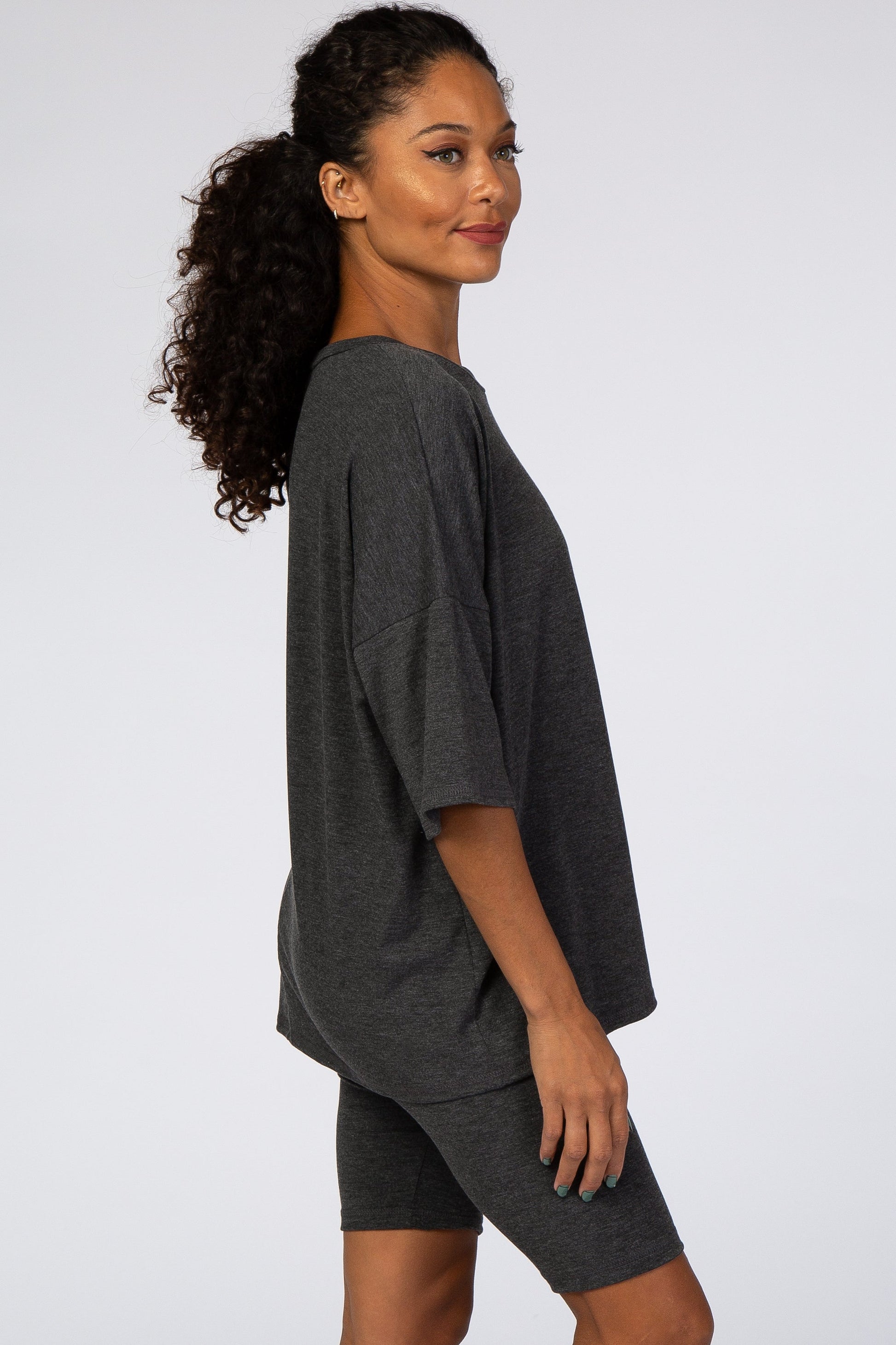 A sleep set featuring a dolman short sleeve top with a front pocket and a pair of biker shorts.