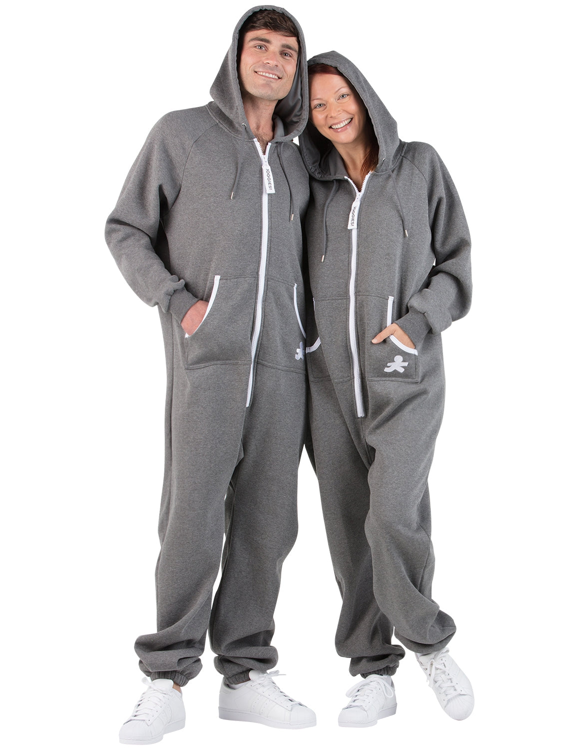 Joggies are the perfect mix between a sweat suit and one piece pajamas! Hoodies and pockets make them stylish and thick sweatshirt fleece makes them ultra-cozy! Ideal for walking the dog on the chilly mornings, enjoying a bonfire while camping, and for sleeping in, too! Roll out of bed ready for the day! Both women and men will love and look gorgeous in gray! And an inclusive size chart makes these the best plus size onesie jogging suits!
