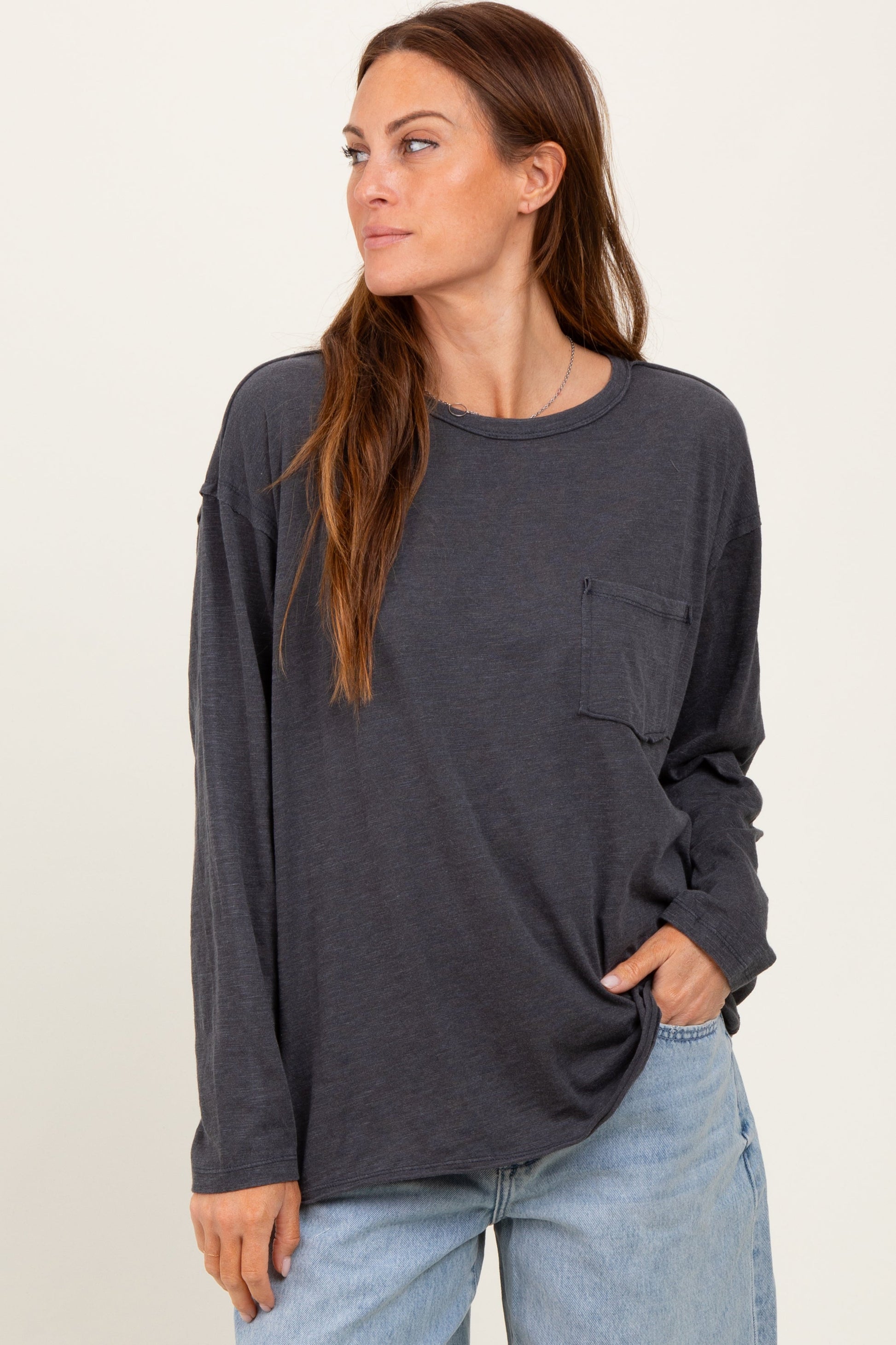 Stay effortlessly stylish and comfortable in our Charcoal Mineral Wash Front Pocket Long Sleeve Top. Made from ultra-soft, breathable fabric with a unique mineral wash finish, this top offers a relaxed fit with dropped shoulders for a laid-back, cozy vibe. Featuring a classic crew neckline and a handy front chest pocket, it’s perfect for casual days or layering. Pair it with your favorite jeans or leggings for an easy, everyday look. Available in versatile charcoal, this long sleeve top is a must-have staple for your wardrobe. Elevate your basics with relaxed comfort and timeless style!