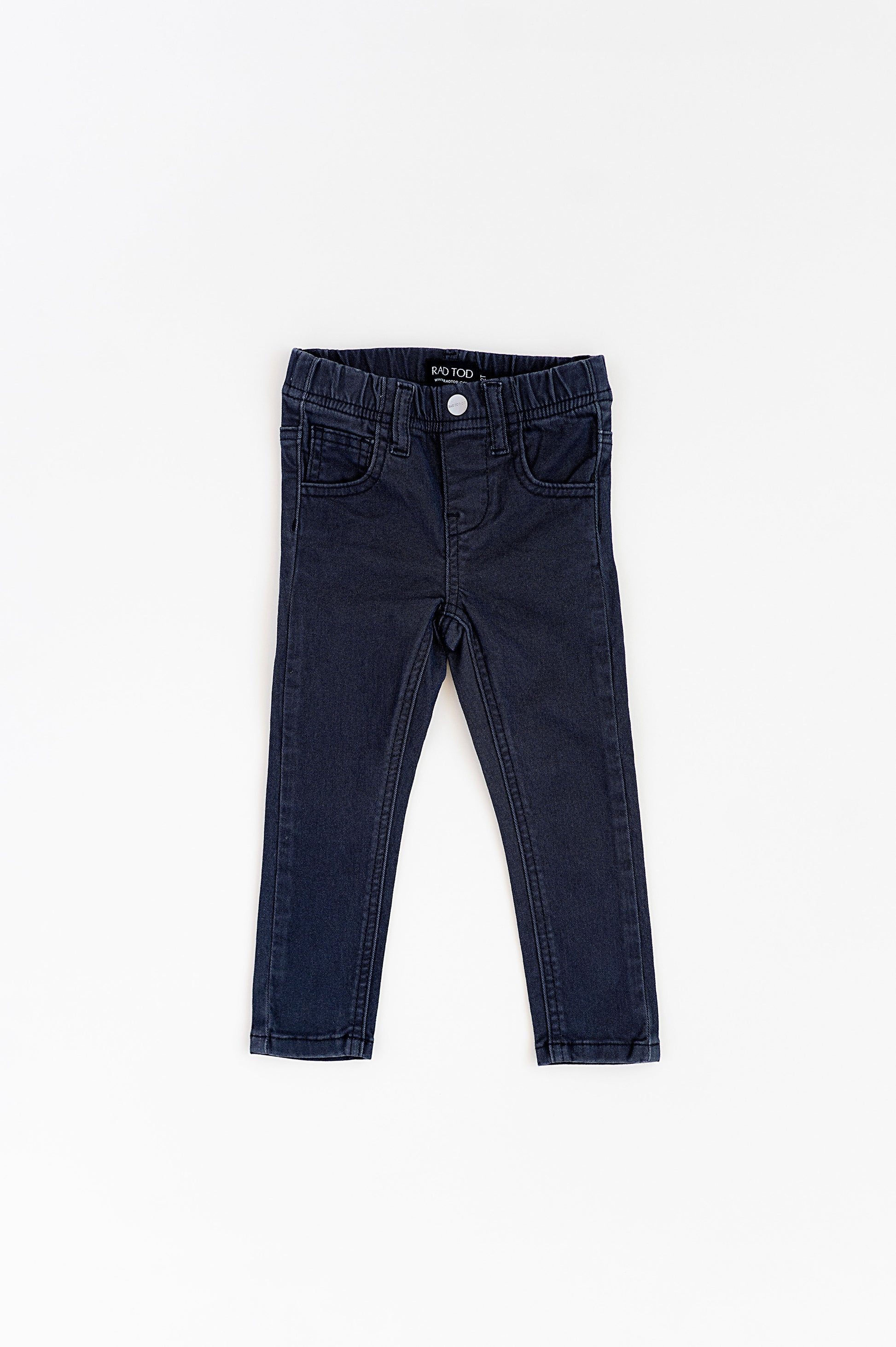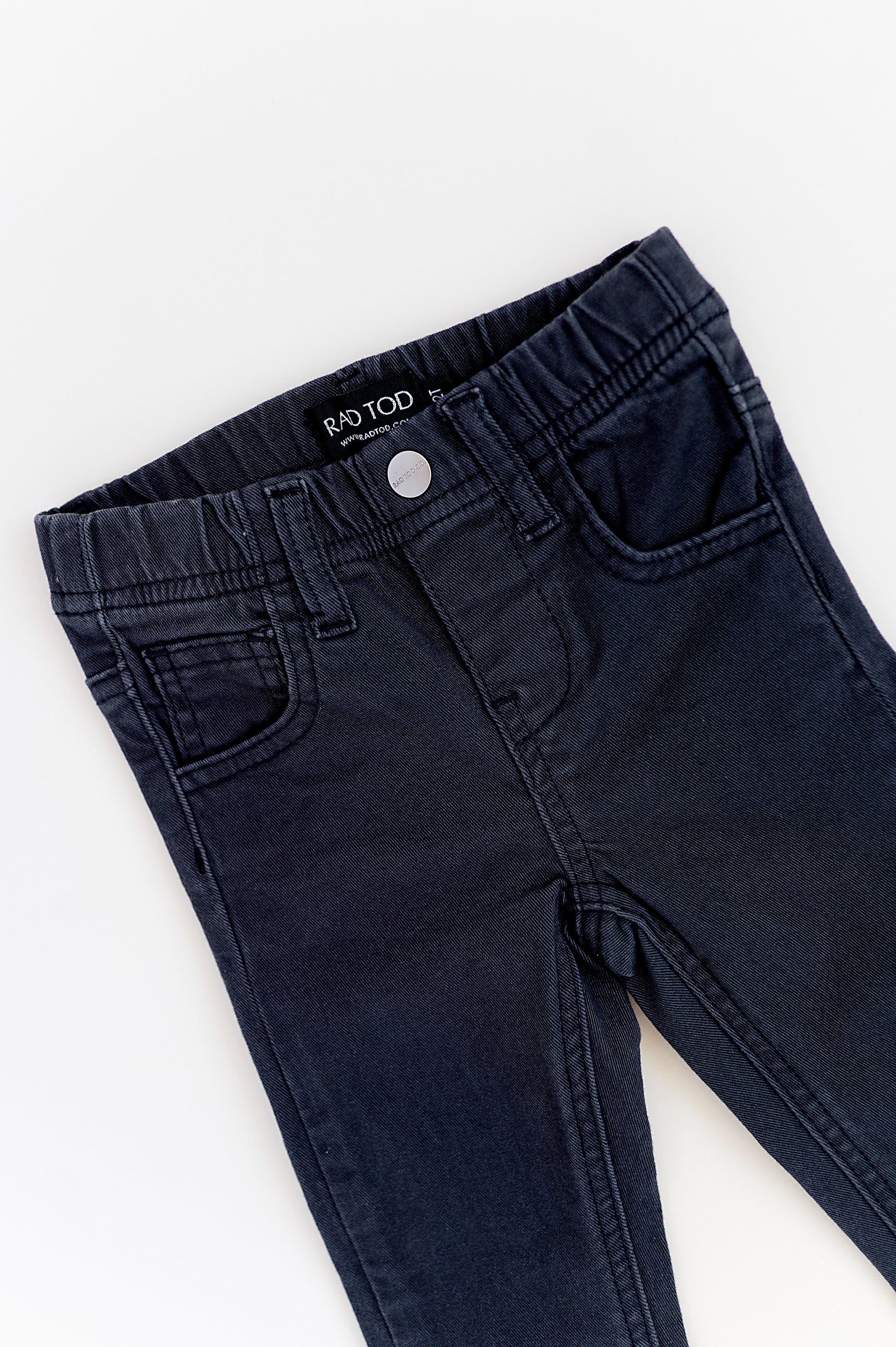 The stretchiest and softest twill denim your toddler will own, because let's be real...they are on the move! We designed these jeans with no functional buttons because when they gotta potty, theres nothing more annoying than having to work with buttons. These are so easy to pull up and pull down when in a hurry! Our pockets are functional and the embroidered logo in the back pocket is just the perfect cherry on top!