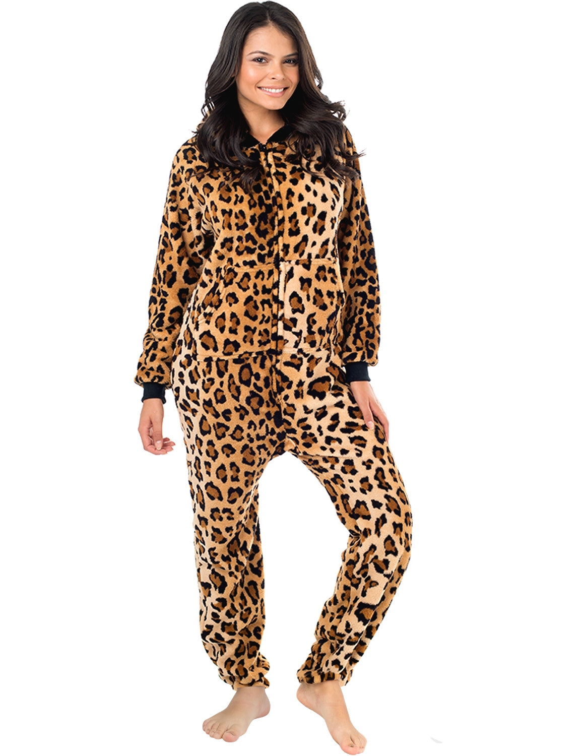 Prowl into the night wearing these jungle kitty inspired leopard print one piece pajamas with hoods! Gorgeous, plush chenille pairs purrfectly with this exotic spotted pattern! Ultra-cozy, high-quality and beautifully designed: beige, brown and yellow undertones lay beneath dark brown and black spots of varying sizes. Channel your inner feline! Sleep, lounge, or play in these warm, wonderful and wild onesies!
