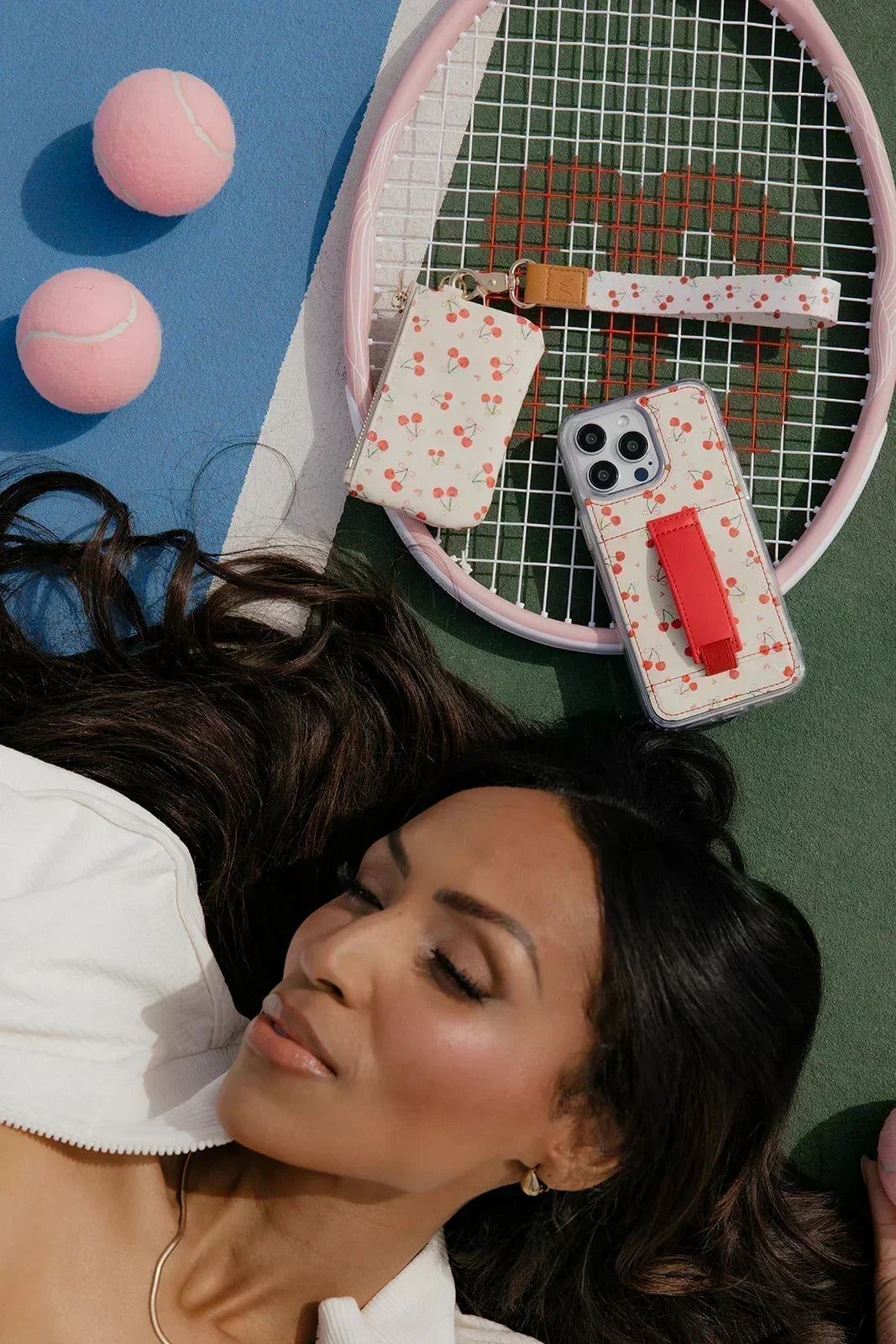 Design: Watercolor red cherries with petite bright bows and pink hearts on a cream background.