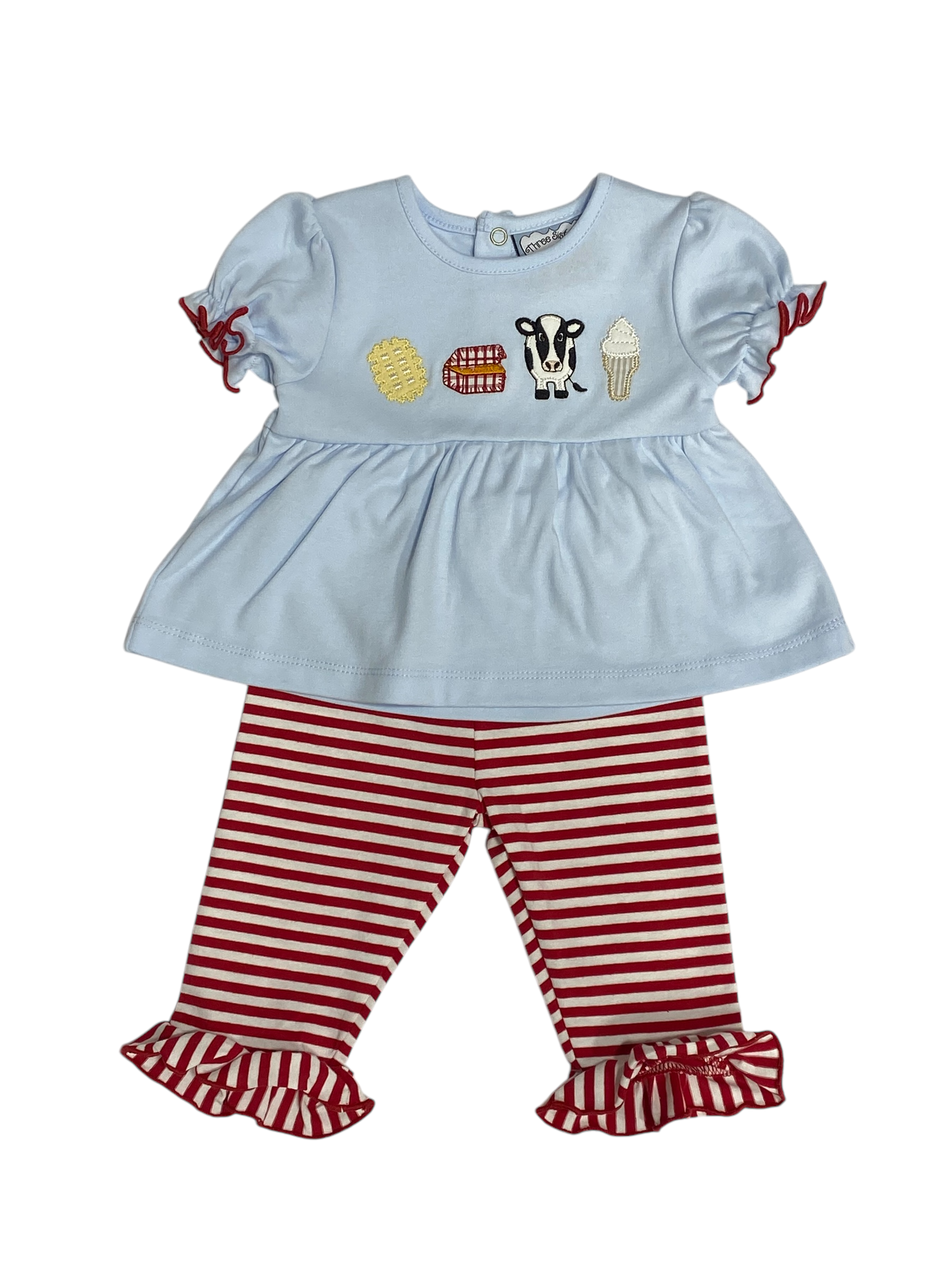 Craving something adorable? 🍟🐄🍦 Say hello to our Chick-fil-A–inspired legging set — the ultimate toddler outfit for your little nugget! This sweet 2-piece features a baby blue puff-sleeve top with the cutest appliqué lineup: waffle fries, nuggets, a cow (of course!), and a swirl of soft-serve ice cream. Paired with red-and-white striped ruffle leggings, it’s giving eat mor chikin in the most stylish way.