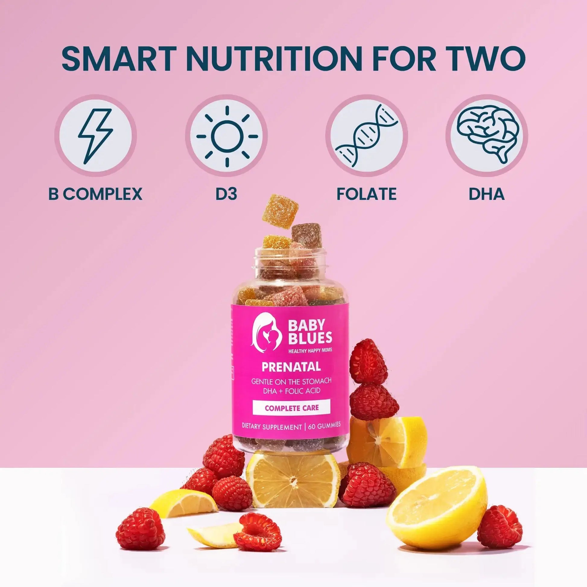 Baby Blues Complete Prenatal Gummy Vitamins are specially formulated to meet the health needs of expecting moms before, during, and after pregnancy. These prenatal gummies provide essential nutrients like DHA, folate, and Omega-3, which are vital for both mom’s and baby’s health.