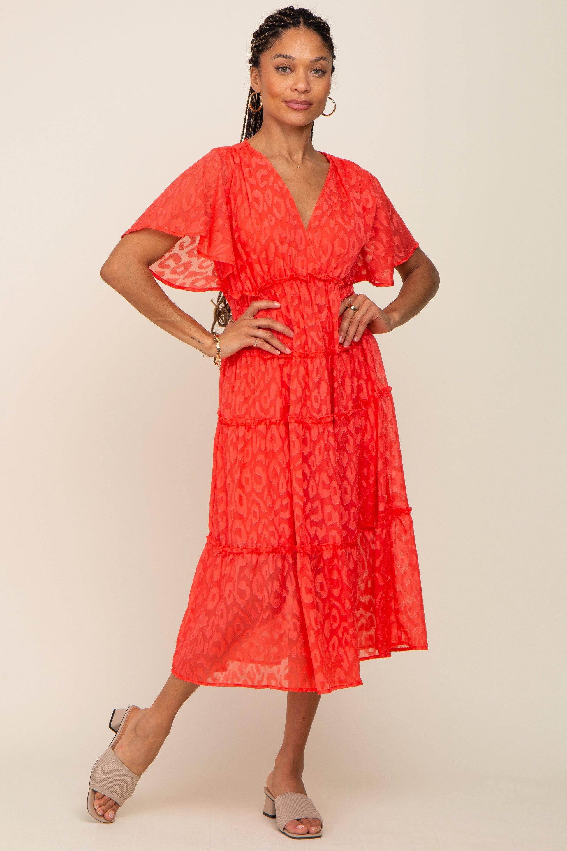 A printed chiffon tiered midi dress with a v-neckline, flutter sleeves and ruffle accents. Dress is partially lined. Sleeves and back are semi sheer.