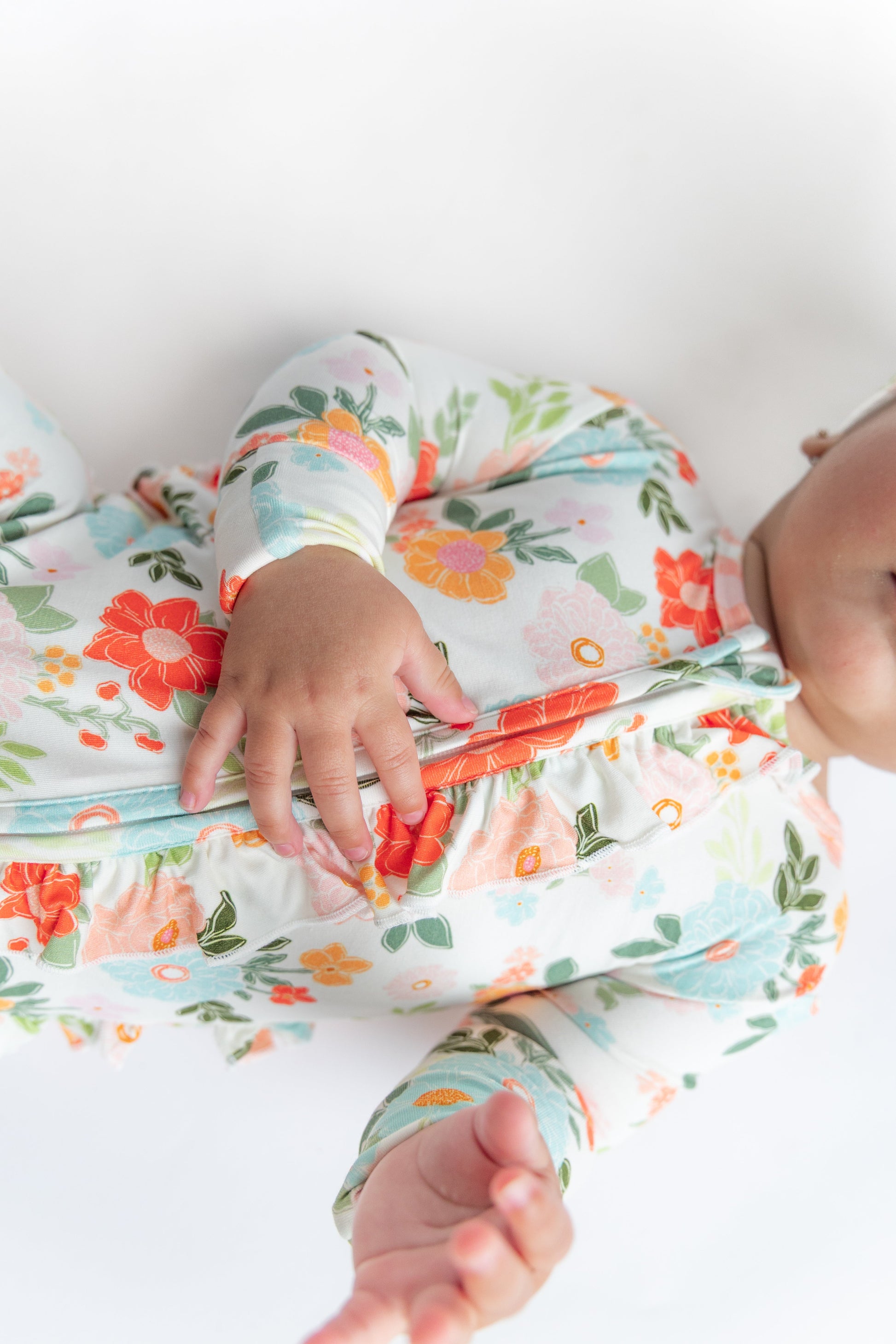Wrap your little one in cozy charm with the Cottage Blooms Bamboo Zip Romper. This vintage floral sleeper features soft bamboo fabric and adorable ruffle details, making bedtime both comfy and cute. Its convertible design easily transforms from romper to sleeper, perfect for playful days and peaceful nights.