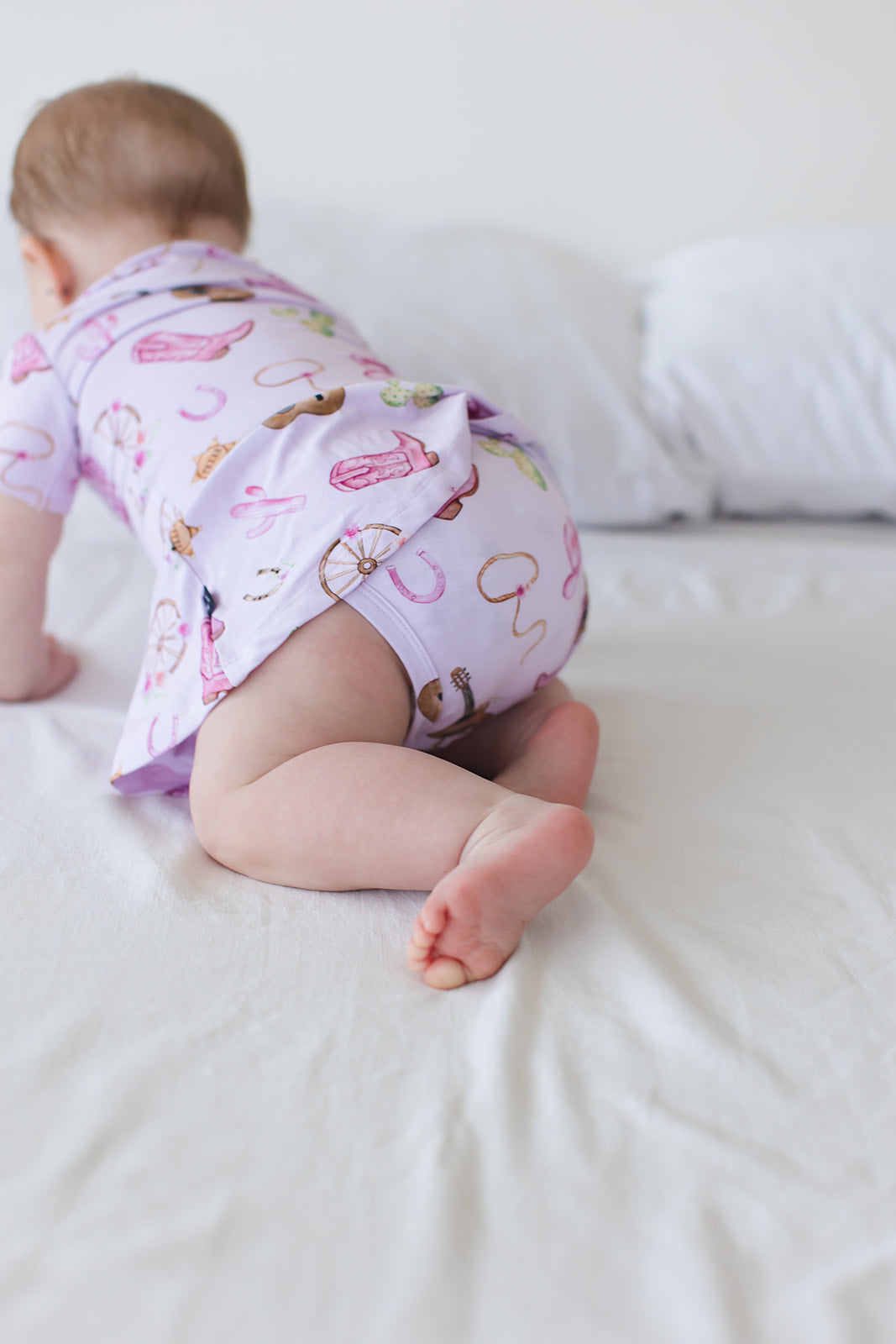 Crafted from buttery-soft, breathable bamboo viscose, these dresses provide all-day comfort for your little one. The built-in bodysuit includes snap closures for quick and hassle-free diaper changes, making them as practical as they are adorable.