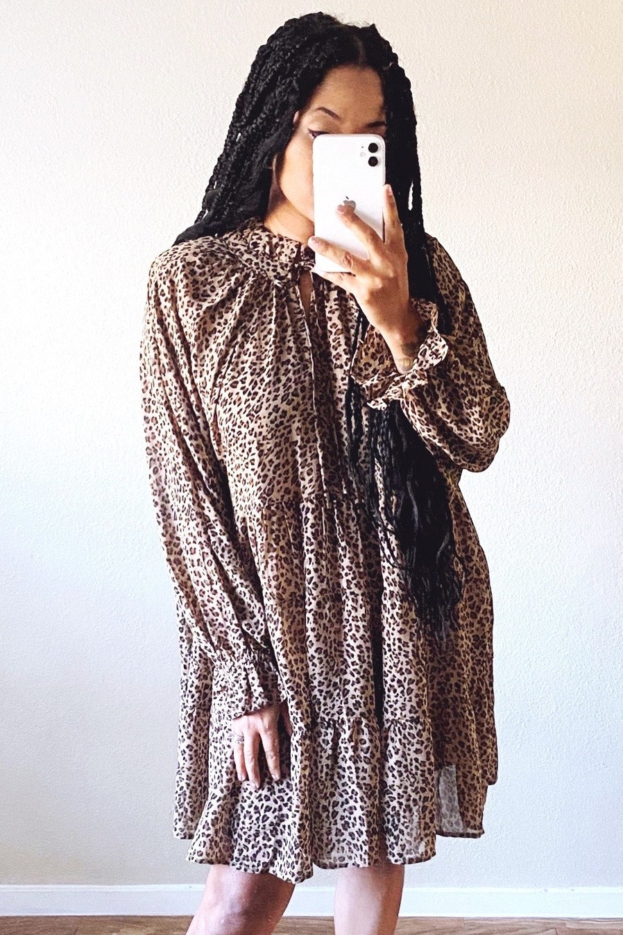 A floral chiffon long sleeve dress. Features ruffle collar with self tie straps, and ruffle details on wrist and bottom hem. Sleeves semi-sheer. Partially lined. This style runs large.
