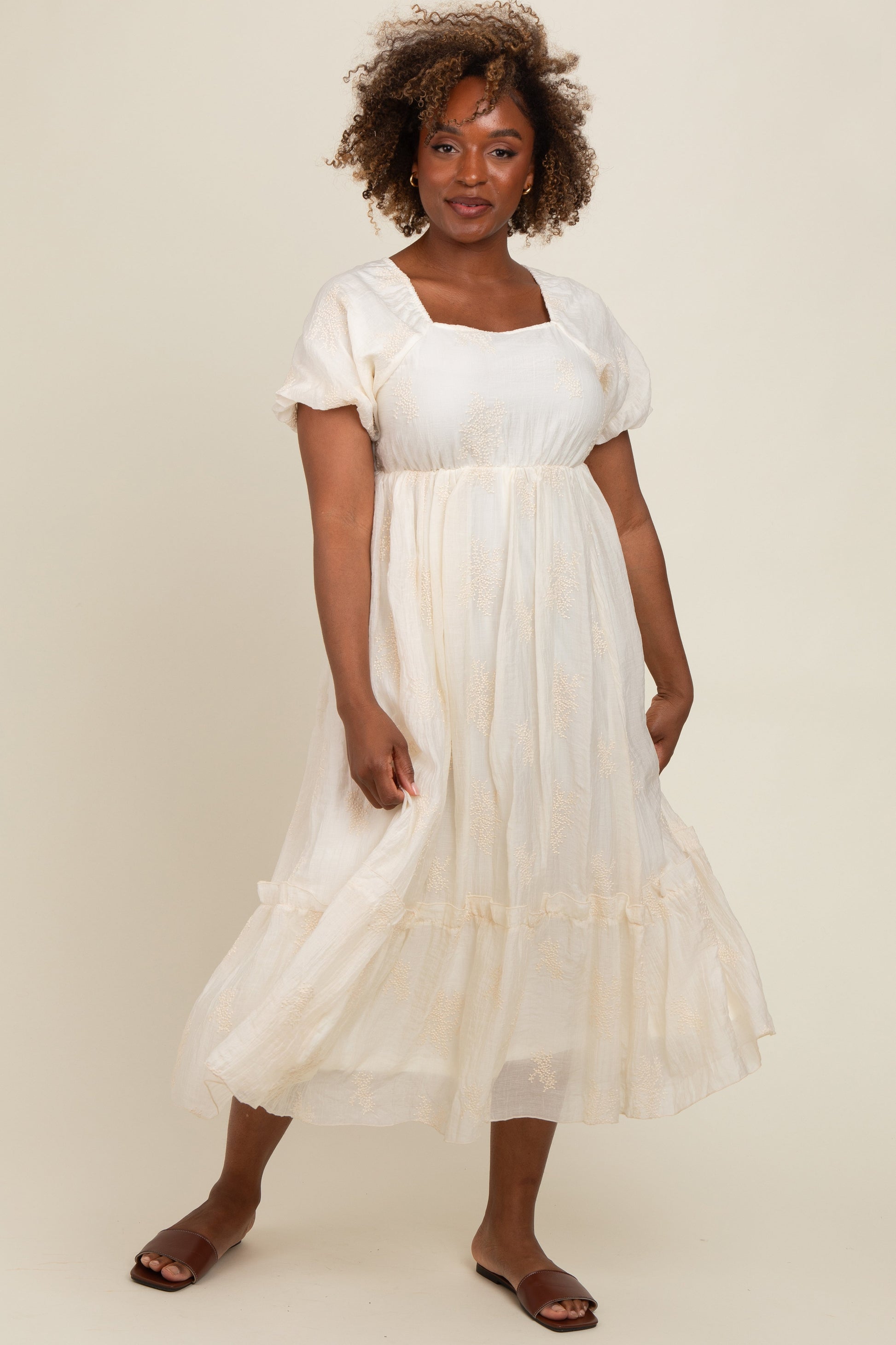 Cream Floral Print Ruffle Hem Midi Dress