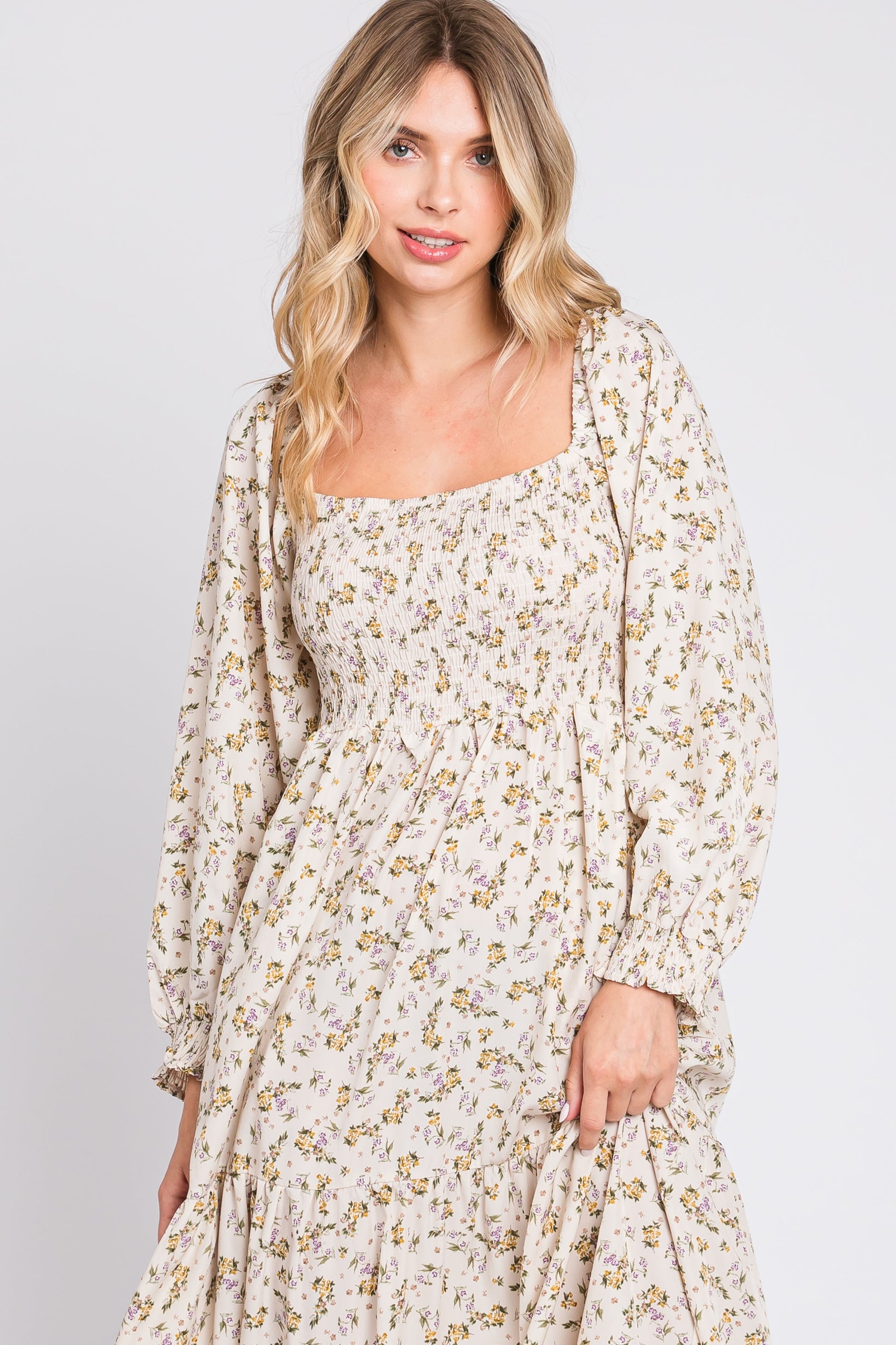 Cream Floral Smocked Long Sleeve Maxi Dress