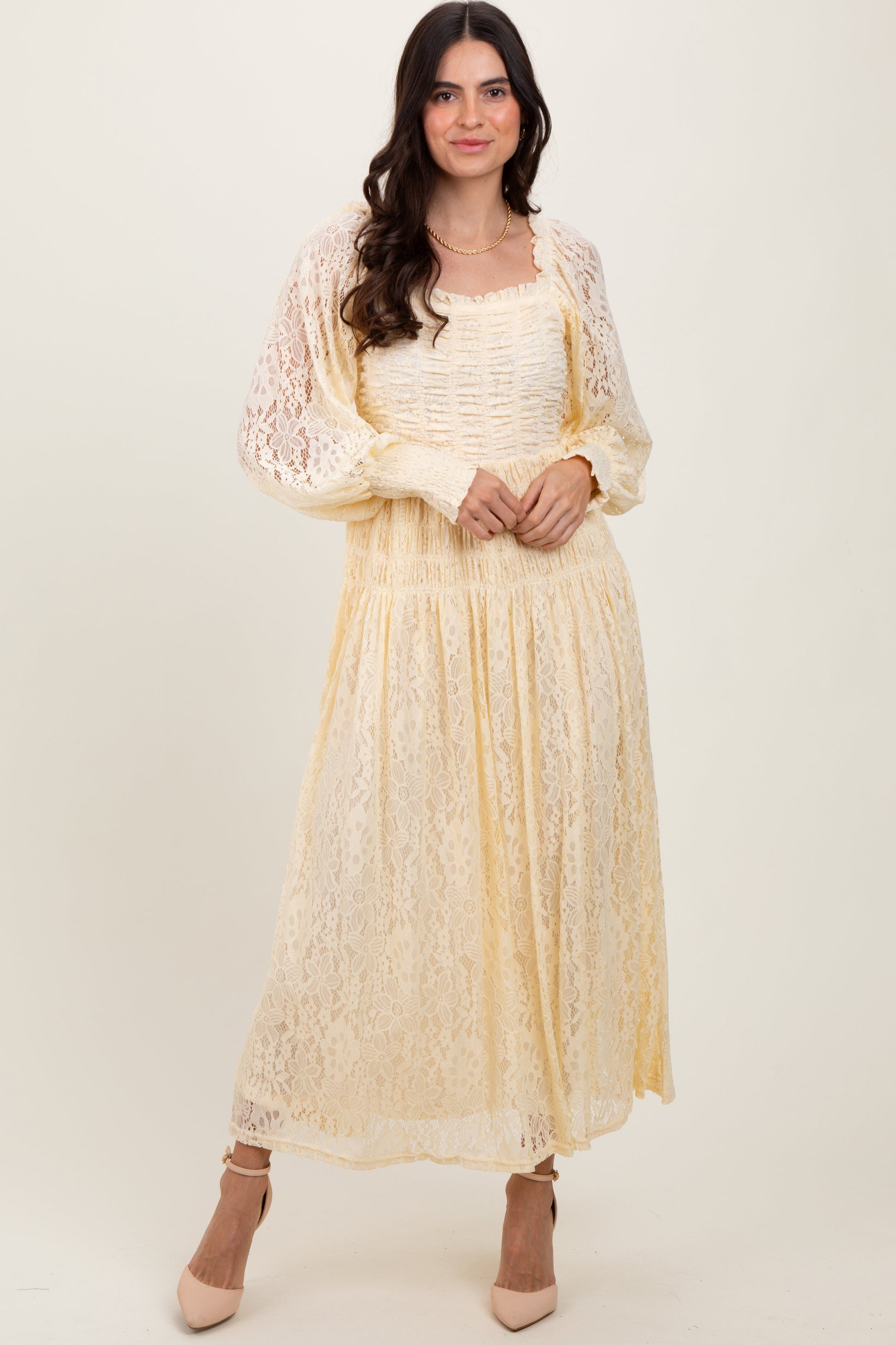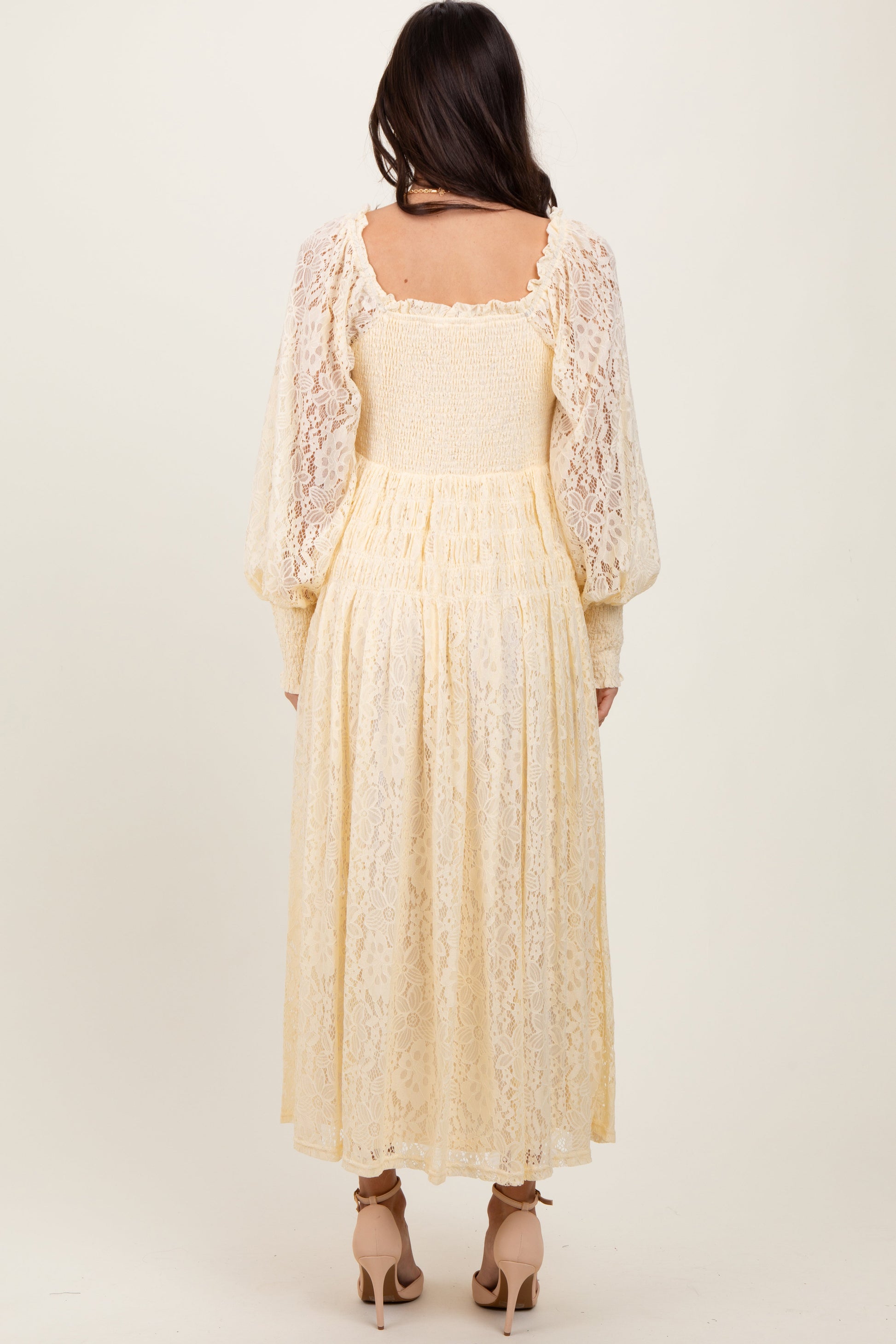 Cream Lace Smocked Bubble Sleeve Maxi Dress