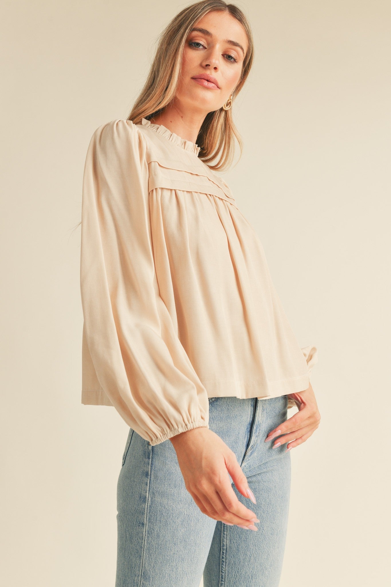 Cream Pintuck Yoke Top With Long Puff Sleeves