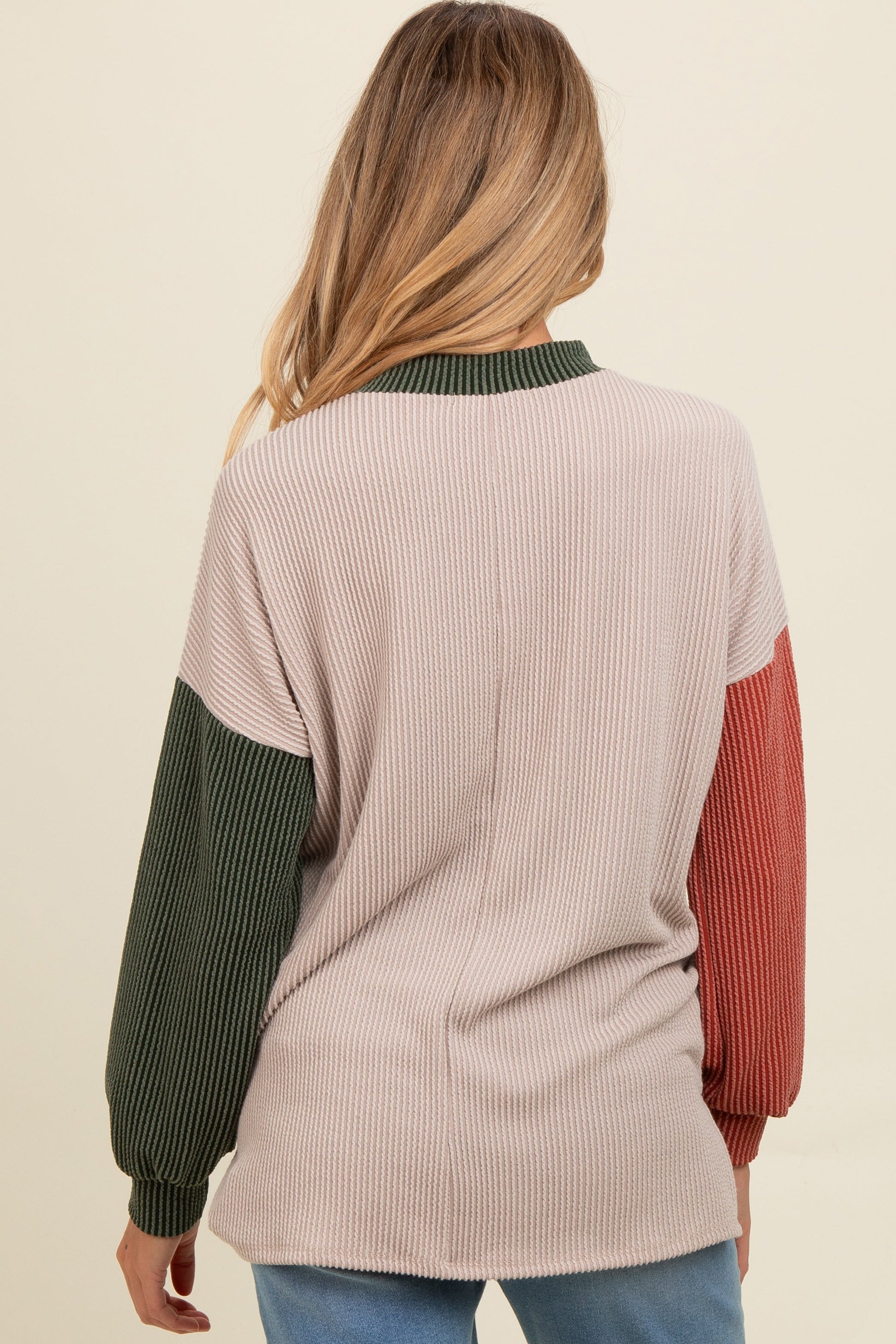 Stay cozy and stylish throughout your pregnancy with our Cream Ribbed Colorblock Maternity Side Slit Top. Featuring soft ribbed fabric, this relaxed-fit top offers ultimate comfort and gentle stretch to accommodate your growing belly. The trendy colorblock design combines cream with contrasting rust and forest green sleeves for a chic, modern look. Side slits add extra flexibility and ease of movement, making it perfect for everyday wear or casual outings. Pair effortlessly with jeans or leggings to keep your maternity wardrobe fresh and fashionable. Embrace comfort without sacrificing style!
