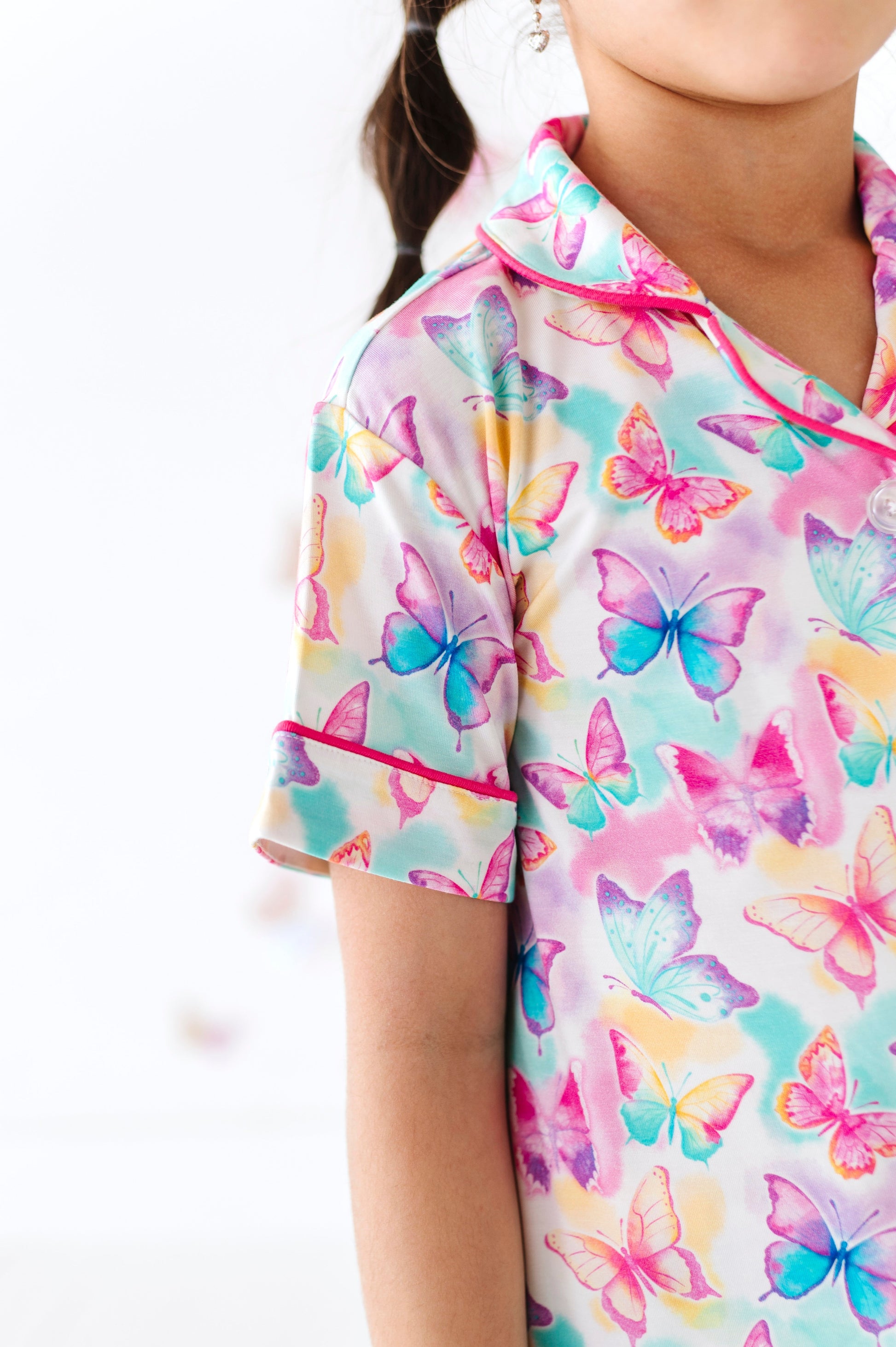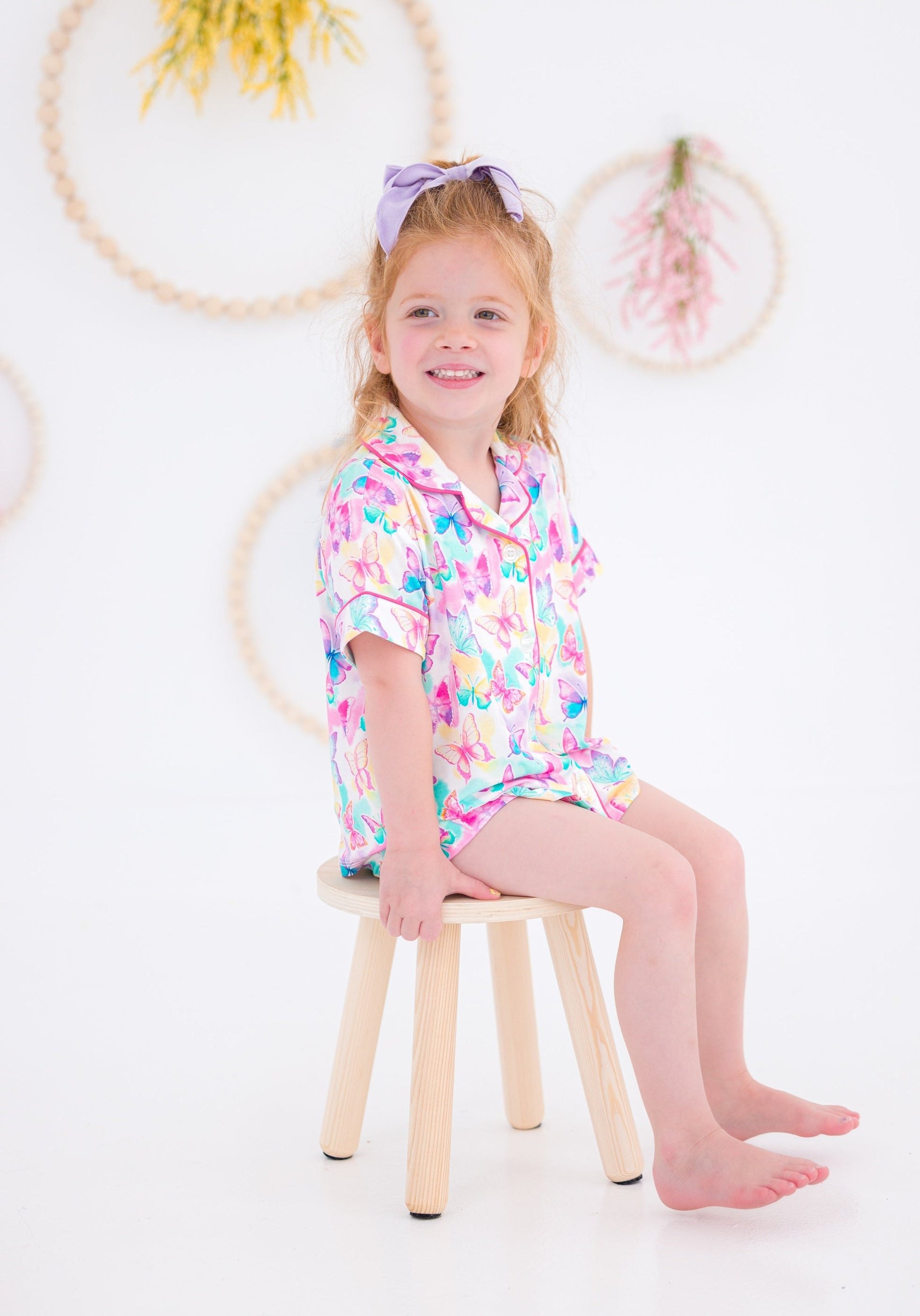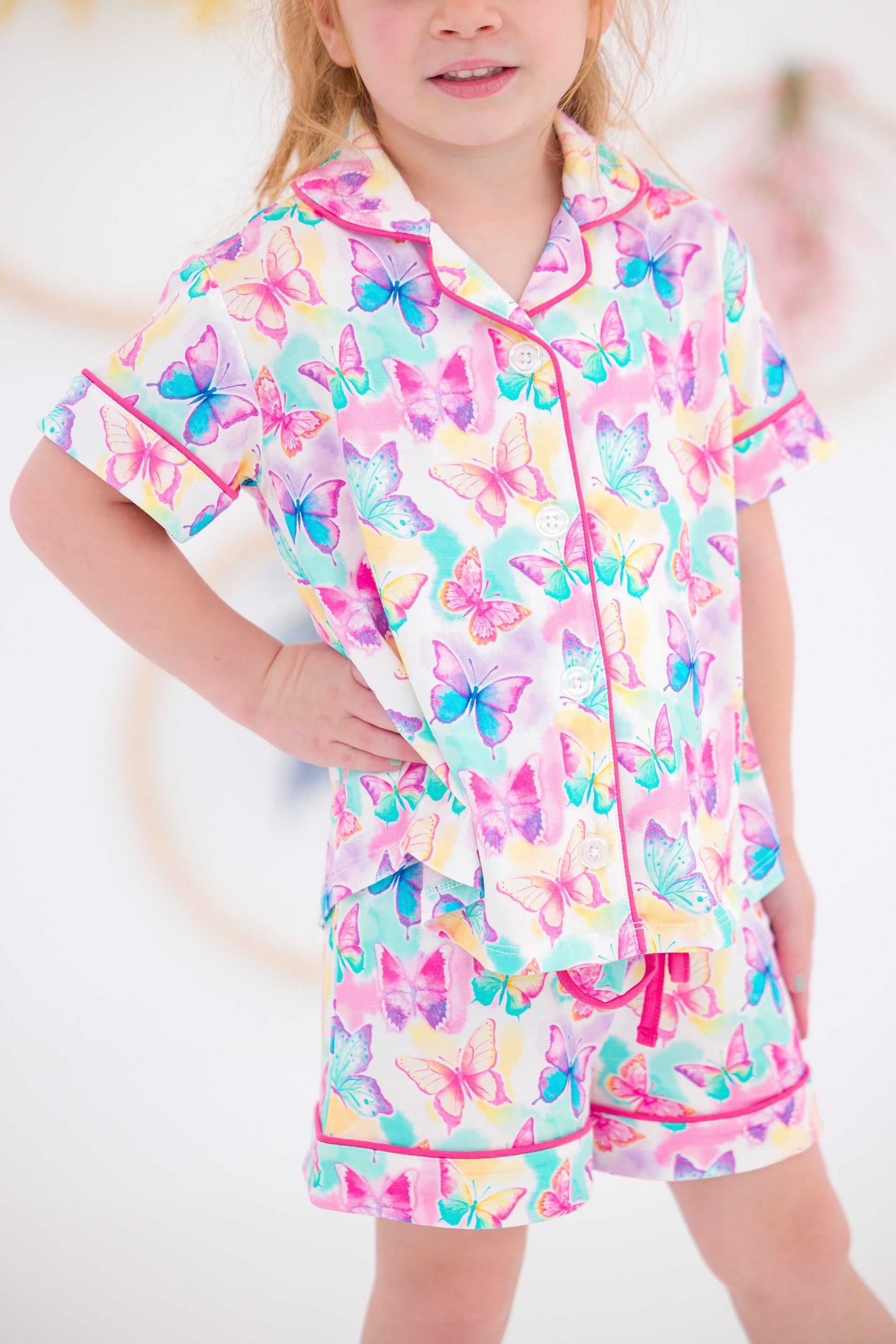 Add a burst of color to your little one’s daywear lineup with this dreamy butterfly two-piece set! Featuring an allover watercolor butterfly print in vibrant rainbow hues, this playful button-up and short set is the perfect blend of fun and comfort. Crafted from our signature bamboo viscose and spandex blend, the fabric is buttery-soft, breathable, and gentle on sensitive skin—ideal for lounging, layering, or sunny-day adventures.