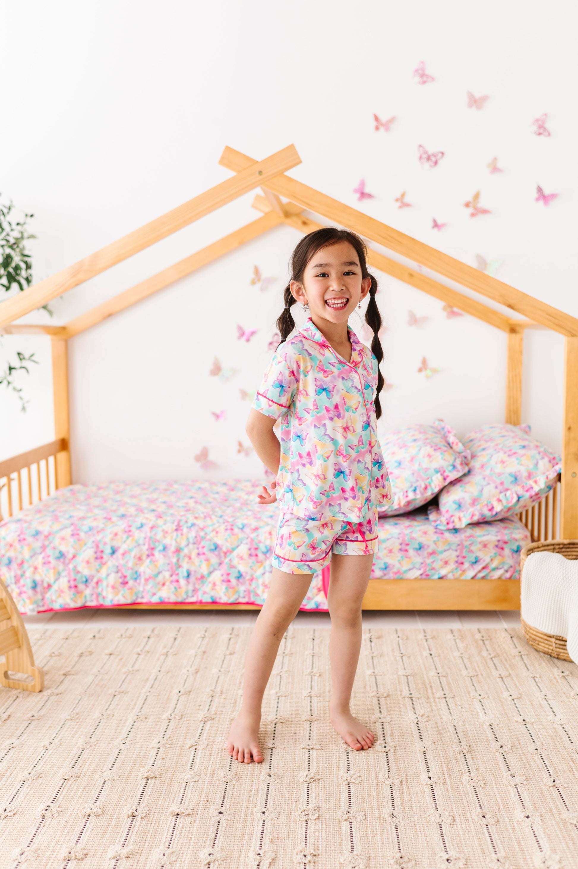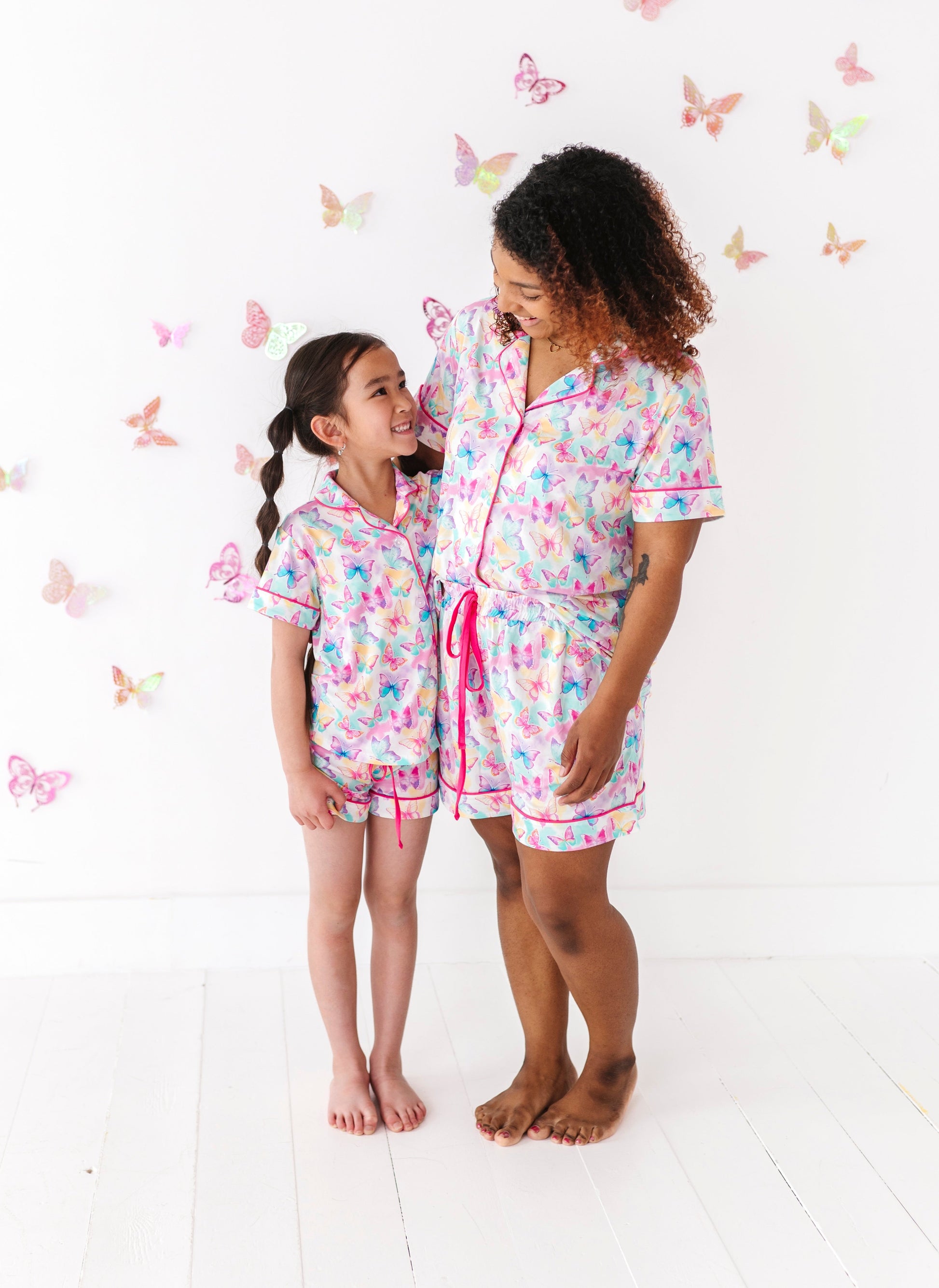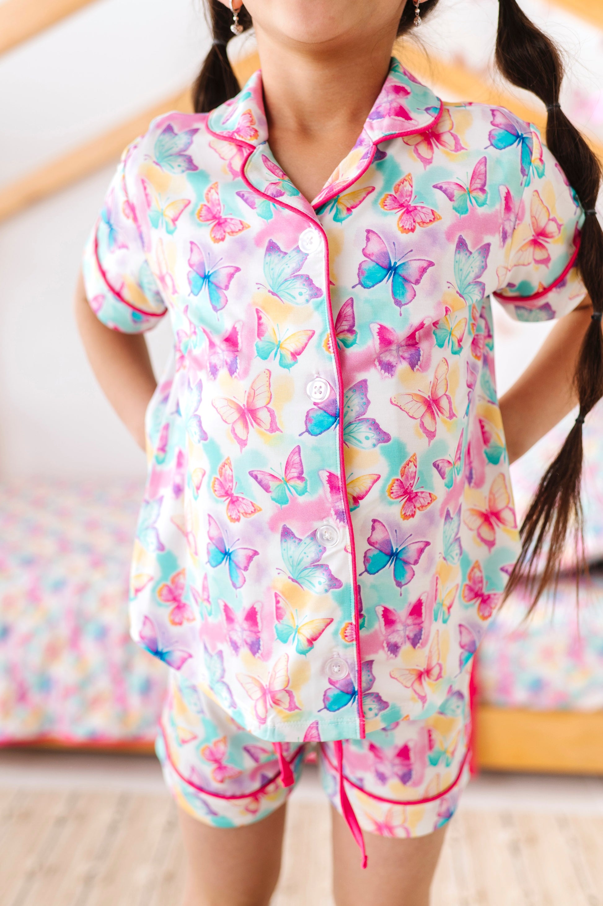 Add a burst of color to your little one’s daywear lineup with this dreamy butterfly two-piece set! Featuring an allover watercolor butterfly print in vibrant rainbow hues, this playful button-up and short set is the perfect blend of fun and comfort. Crafted from our signature bamboo viscose and spandex blend, the fabric is buttery-soft, breathable, and gentle on sensitive skin—ideal for lounging, layering, or sunny-day adventures.