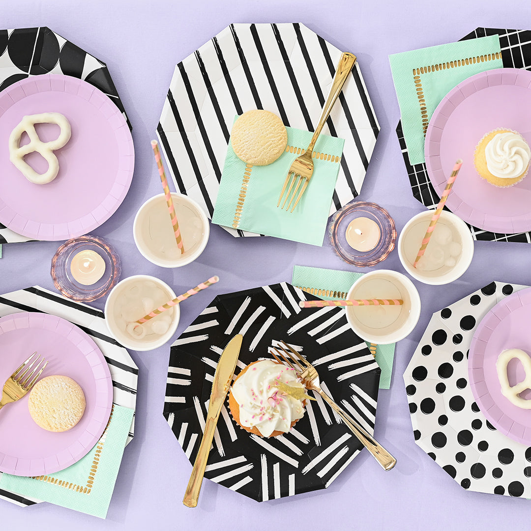 The artistic geometric designs on these large plates will turn heads on any table. The black-and-white palette lends a cosmopolitan vibe, and the plates are sturdy enough to handle any dish. Includes 10 plates.