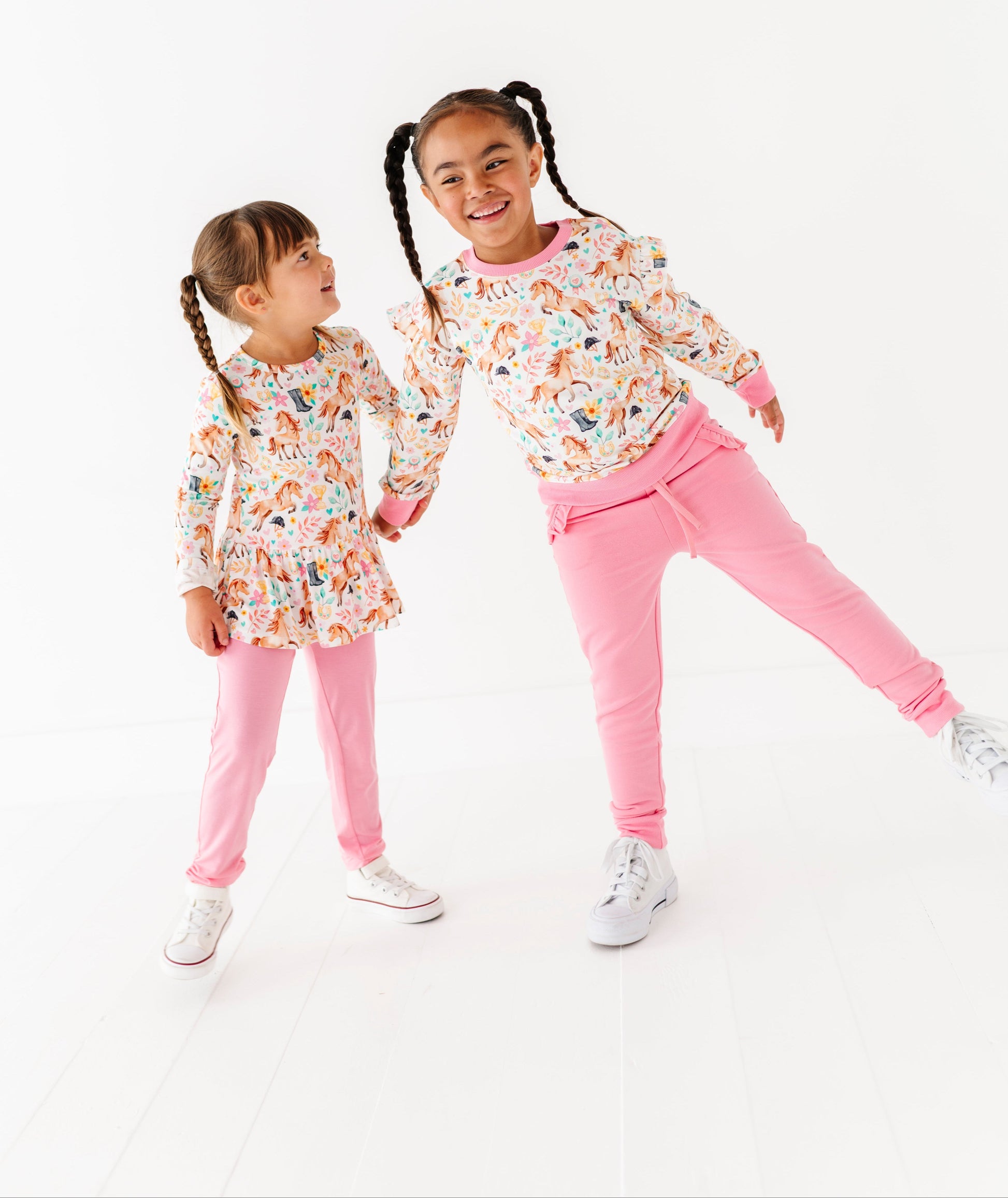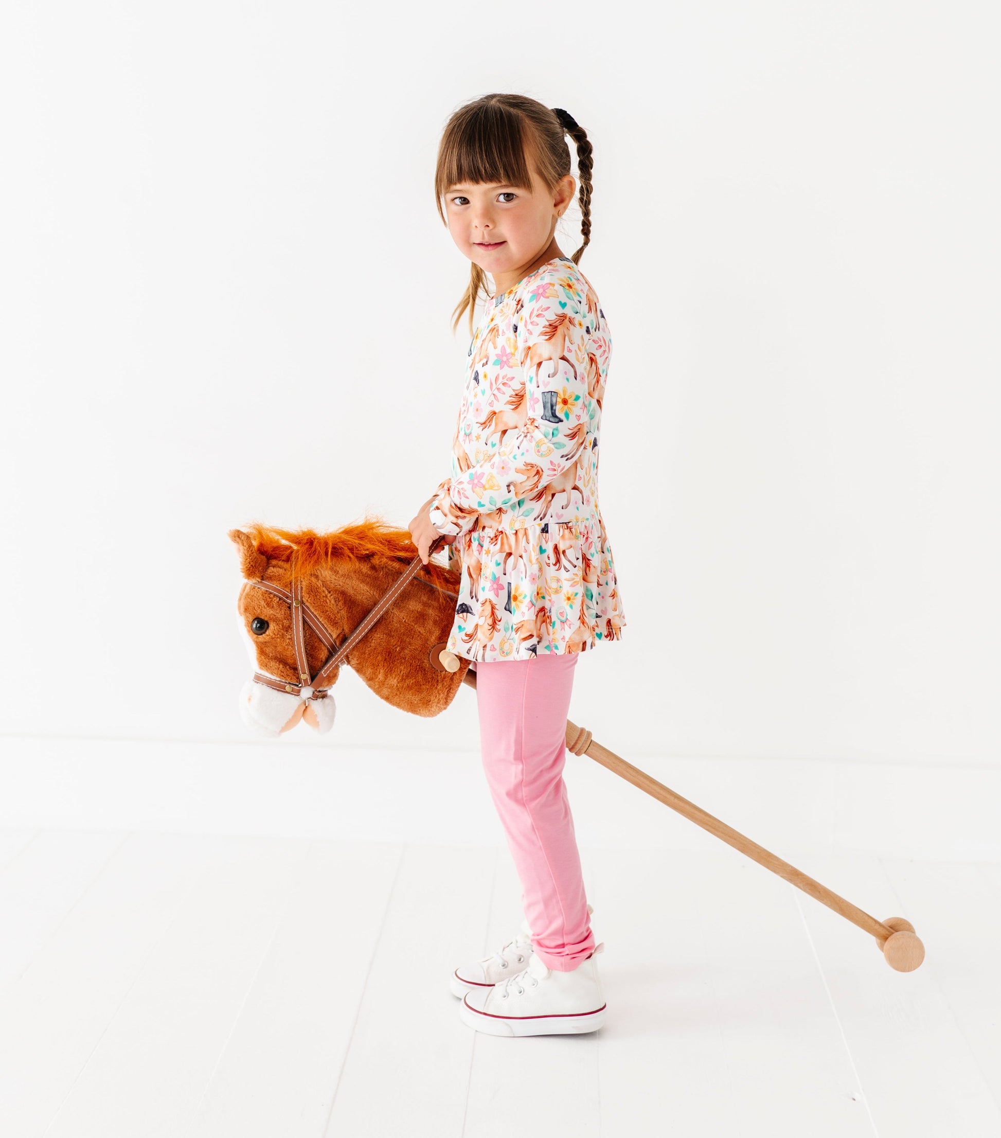 This adorable peplum set features a whimsical equestrian print with graceful horses, riding boots, florals, and sweet stable-inspired details. The flouncy peplum top pairs perfectly with comfy matching leggings. Both made from our signature bamboo blend for buttery softness, breathable stretch, and all-day comfort. It’s the perfect outfit for playdates, pony rides, and picture-perfect adventures.