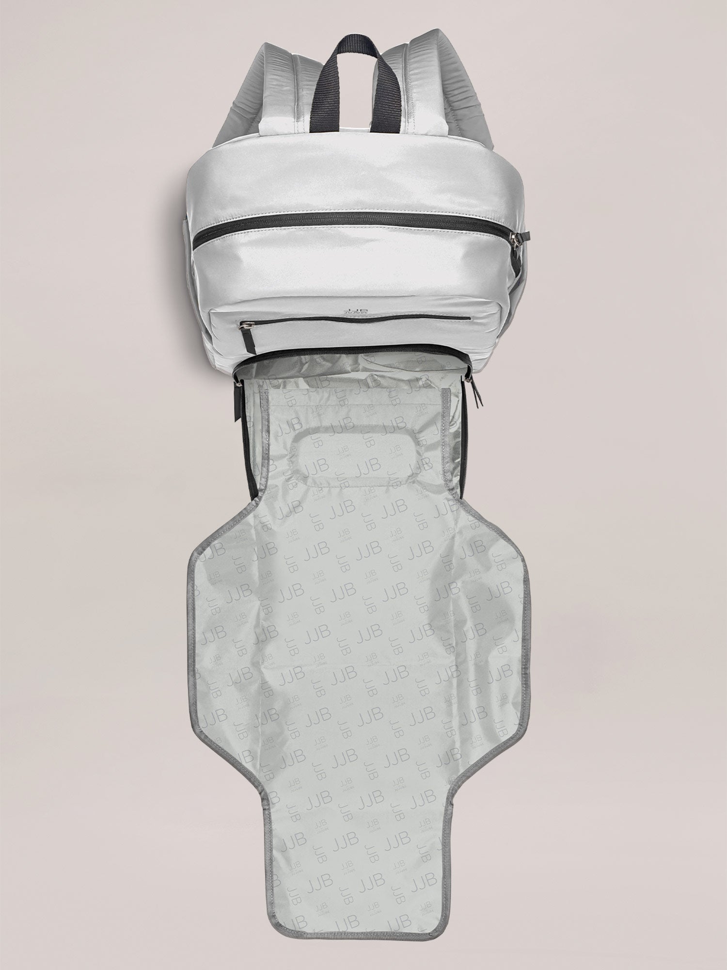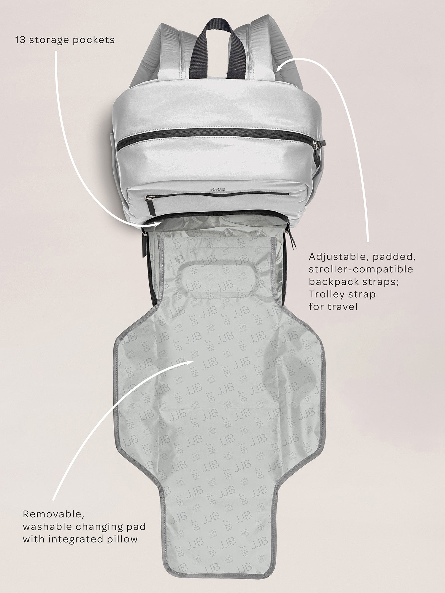 Parent life just got easier with the Deluxe Backpack from JJB by JuJuBe. This backpack’s front-pocket changing station stores diapers and wipes and includes a washable changing pad with integrated pillow—everything you need to make diaper changing quick and easy wherever you are. Feeding is simple with the insulated bottle pocket that holds any sized bottle, and additional storage compartments keep everything in its place and easy to find. The Deluxe Backpack has padded, stroller-compatible backpack straps and a trolley strap so you can travel with the little ones in comfort. When you’re organized and prepared with a backpack full of solutions, you can enjoy your time out with the kids that much more!