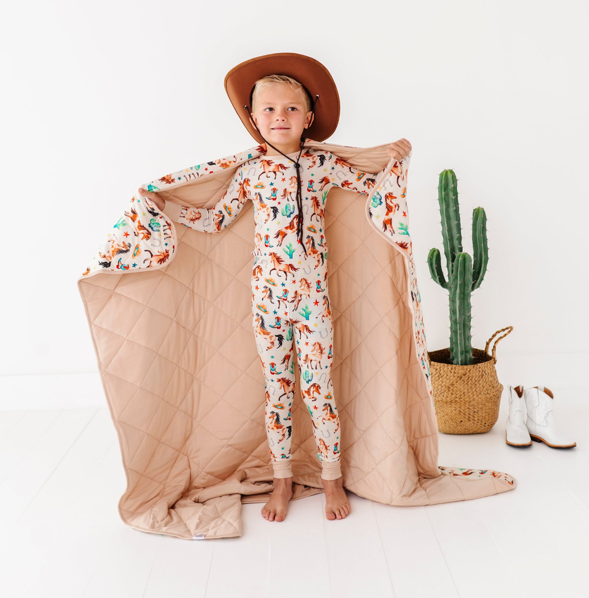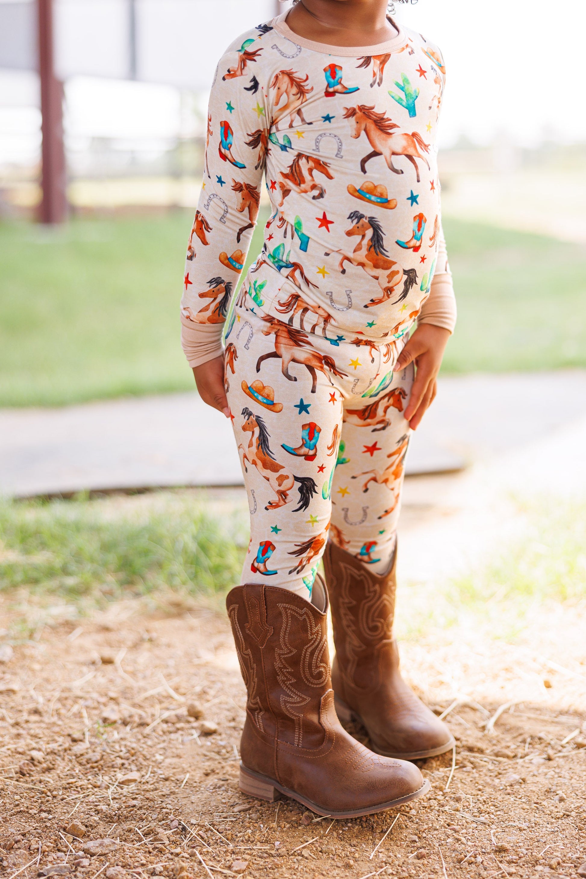 Giddy up for the coziest dreams on the range! This playful two-piece pajama set features a wild western print with galloping horses, cowboy boots, hats, stars, cacti, and more—perfect for your little wrangler. Made from our signature bamboo viscose blend, it's stretchy, breathable, and buttery soft. Ideal for bedtime, playtime, or relaxing after a long day on the (imaginary) ranch.