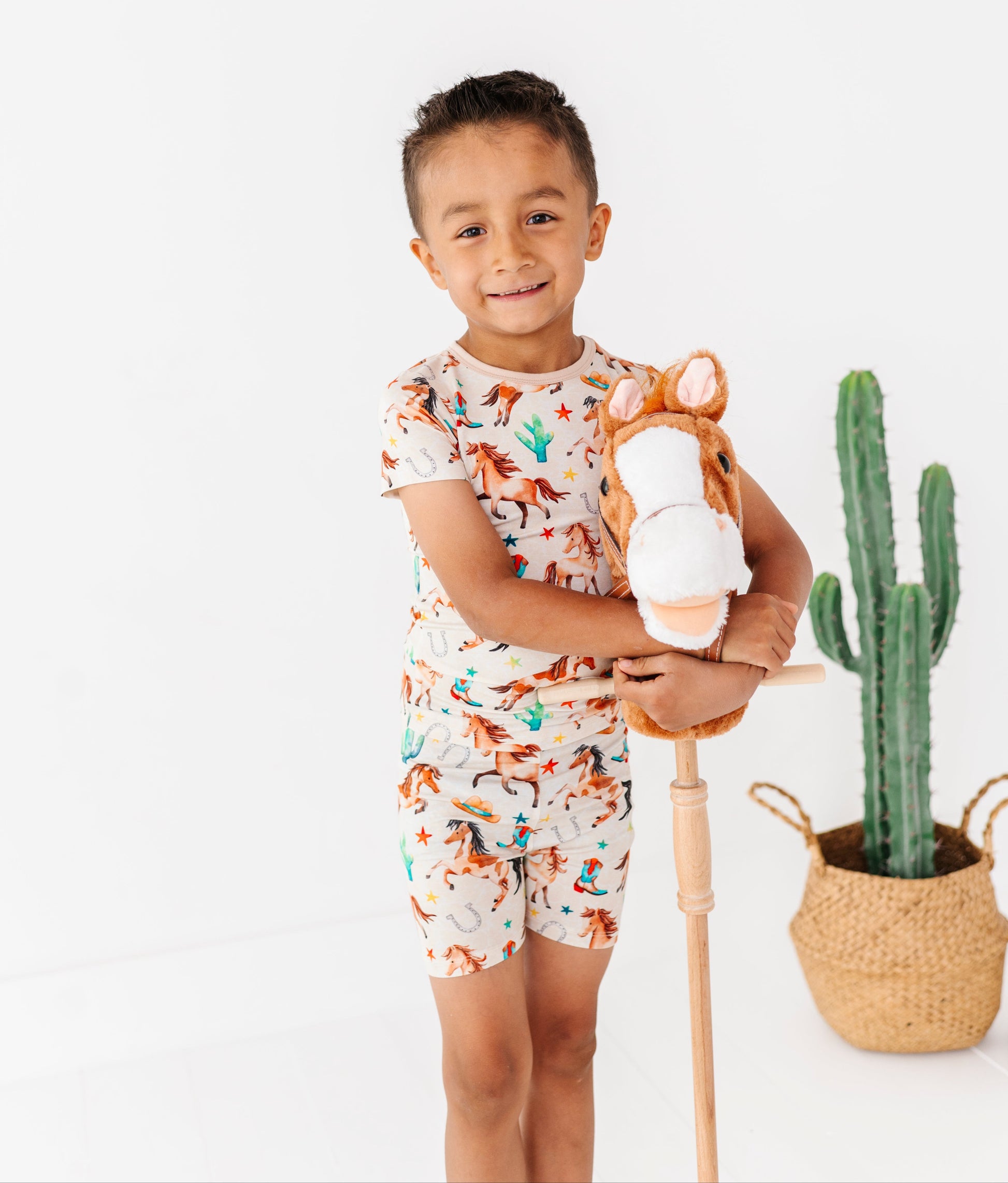 Giddy up for the coziest dreams on the range! This playful two-piece pajama set features a wild western print with galloping horses, cowboy boots, hats, stars, cacti, and more—perfect for your little wrangler. Made from our signature bamboo viscose blend, it's stretchy, breathable, and buttery soft. Ideal for bedtime, playtime, or relaxing after a long day on the (imaginary) ranch.