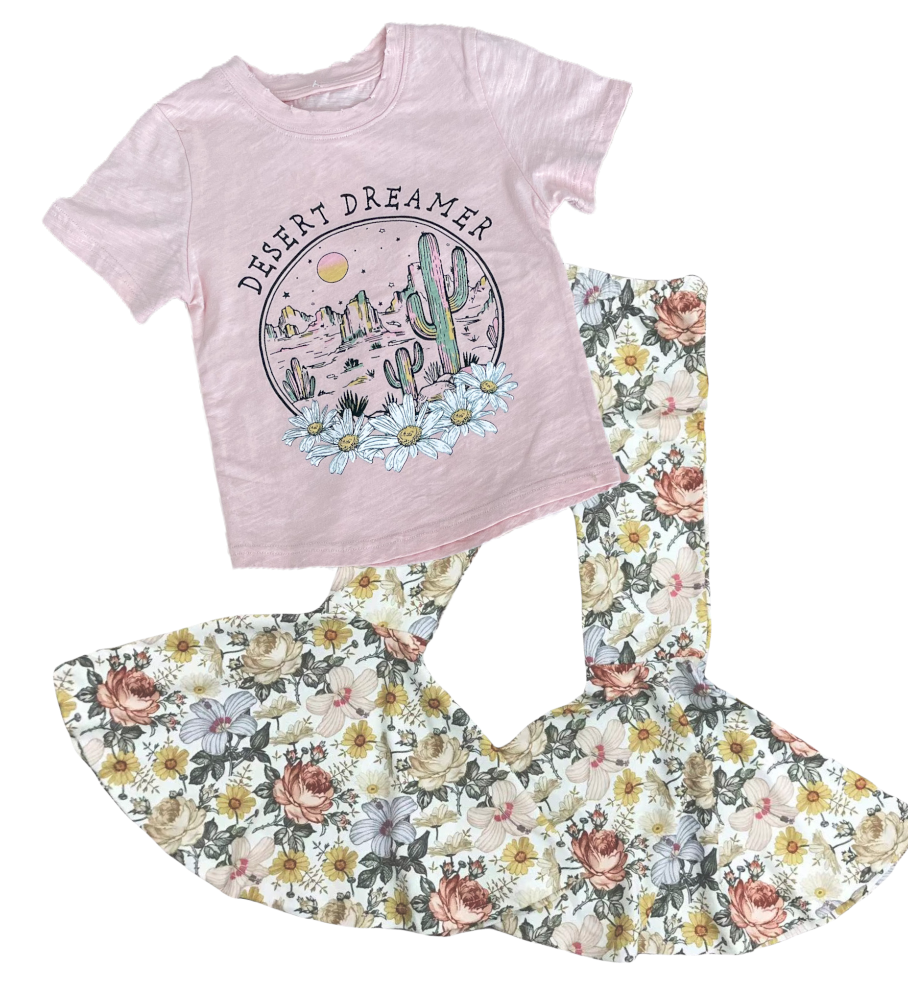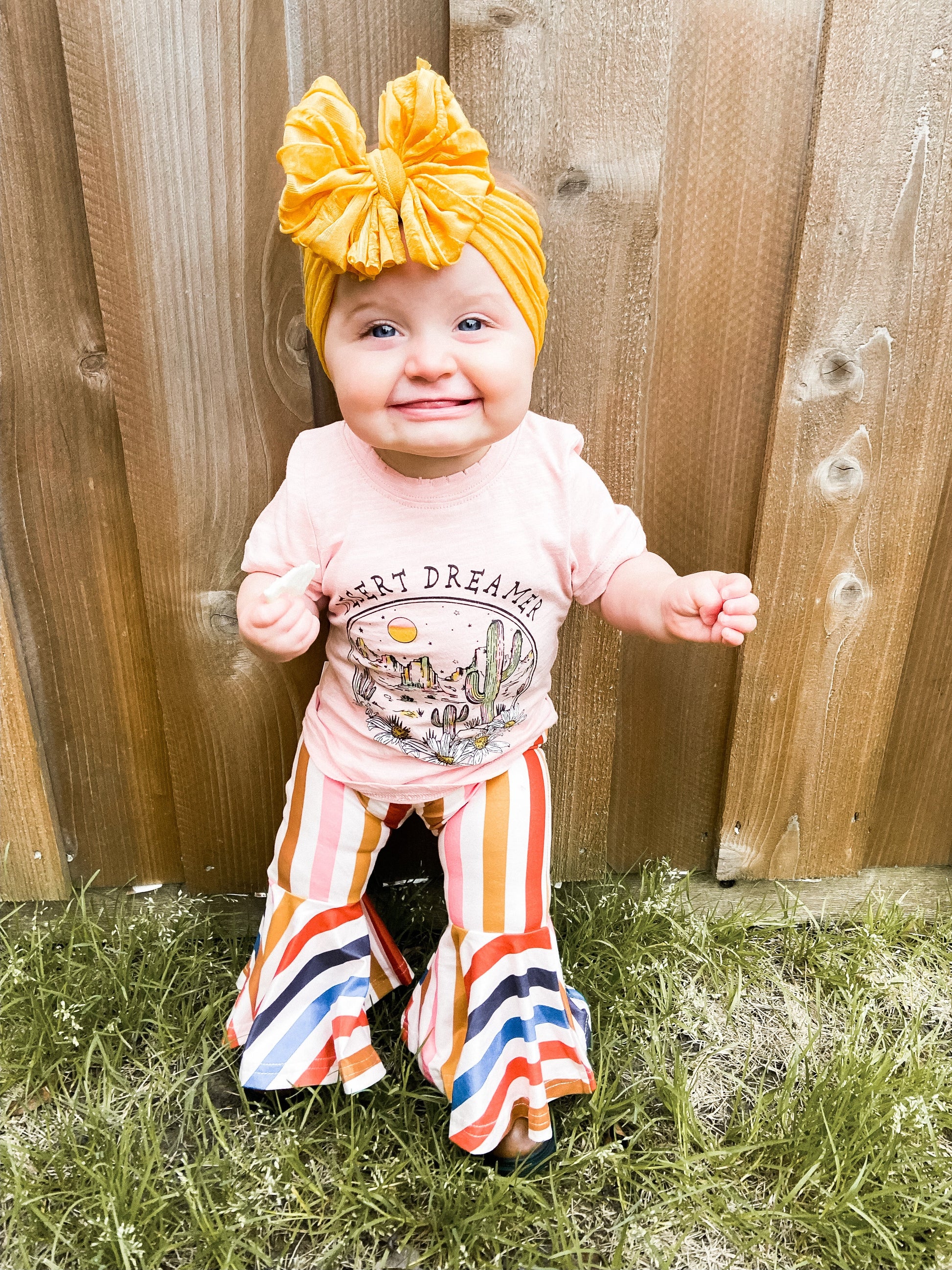 Rockin Bottom Desert Dreamer Distressed Graphic tee shirts are 100% Cotton and have distressed hem at the neck. These tops pair perfectly with our Bell Bottom Pants and ruffled headbands or clippys.