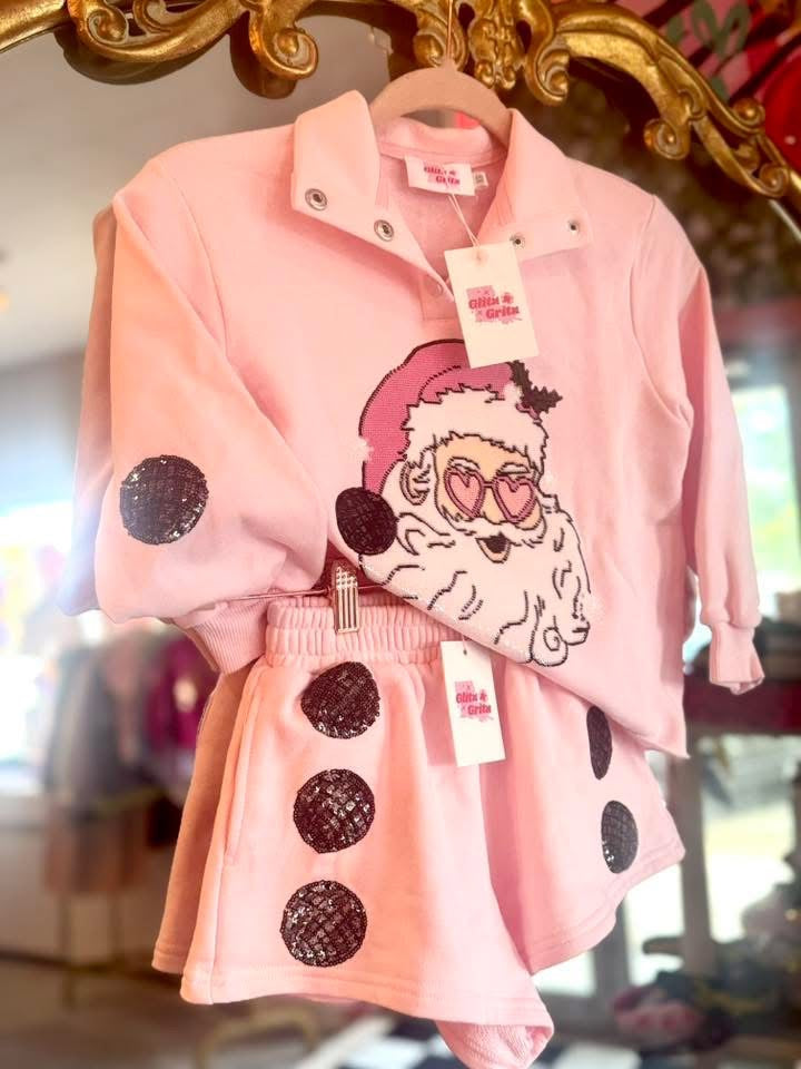 Get holiday party ready with our adorable Disco Santa Sequin Sweatshirt & Shorts Set! This pink two-piece girls' Christmas outfit features a sparkly sequin Santa with heart-shaped sunglasses and black sequin polka dot accents for a fun, festive touch. The cozy sweatshirt pairs perfectly with the matching shorts for a stylish and comfortable holiday look.
