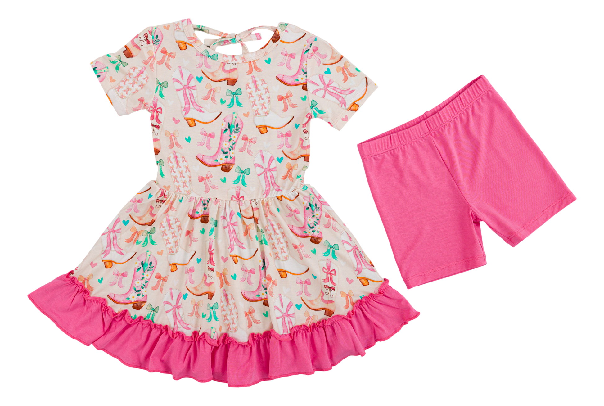 Yeehaw with a twist of sweetness. This cowgirl boot twirl dress set is ready for every little rodeo and playdate adventure! Covered in whimsical boots, bows, and hearts, it brings western charm with a girly flair. The layered ruffle hem gives it extra twirl power, while the matching shorts keep little ones covered and comfy for all-day play. Crafted in our signature bamboo blend, it’s buttery-soft, stretchy, and breathable. Perfect for everything from the classroom to the county fair.