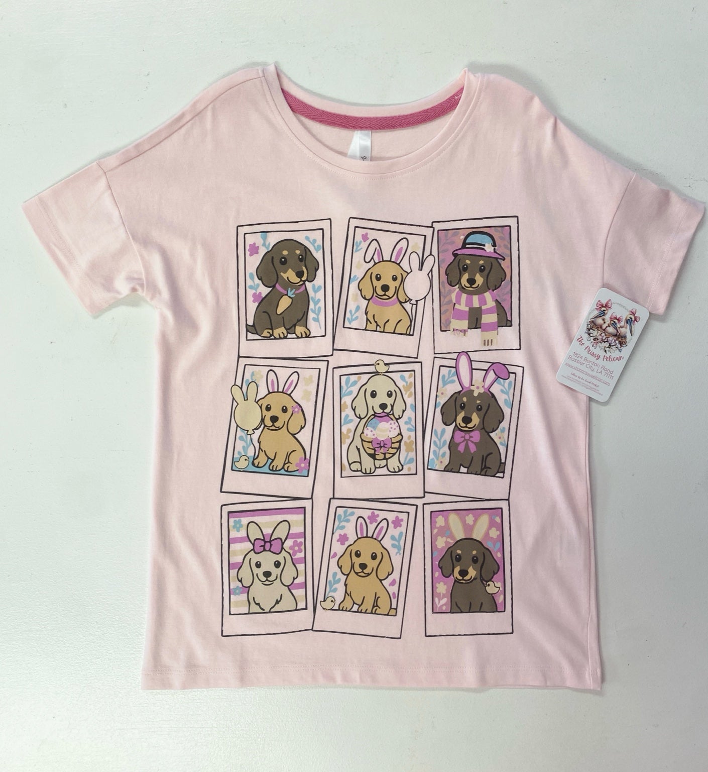 Celebrate spring in the cutest way with this Easter Puppy Photo Grid Tee for tween girls. Featuring an adorable grid of playful puppy illustrations dressed in Easter accessories—bunny ears, bows, chicks, and pastel details—this soft pink t-shirt is perfect for the season.