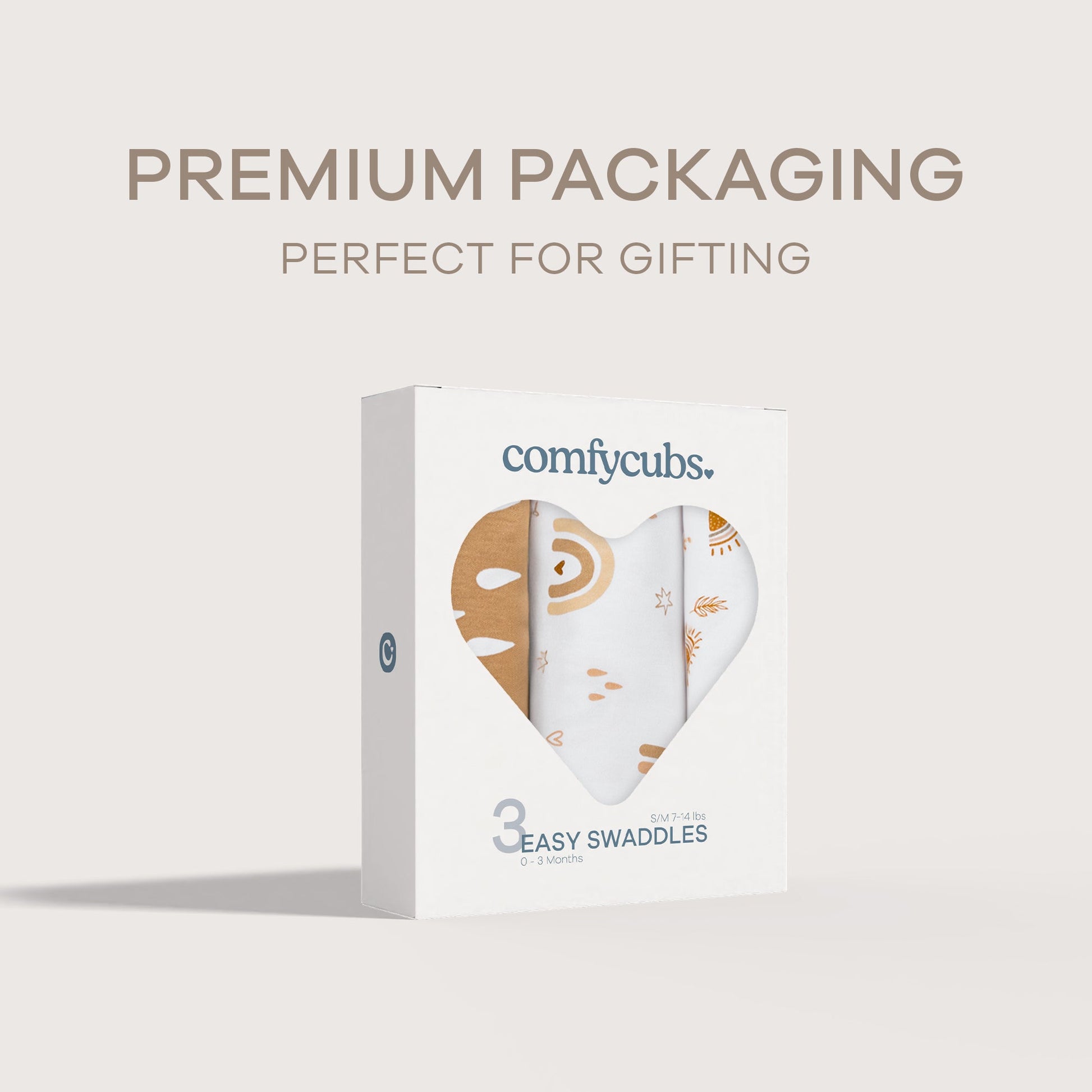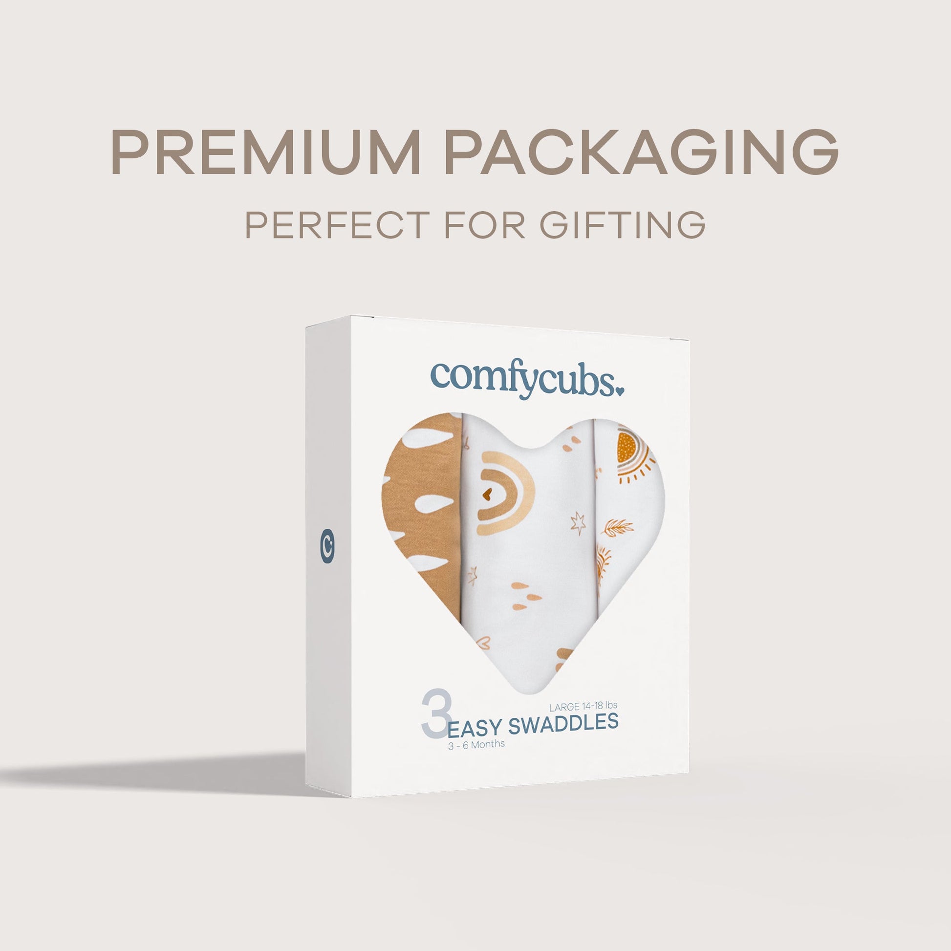 Discover the calming benefits of swaddling By recreating the secure and cozy feeling of mommy’s womb, Comfy Cubs Swaddle Blankets for newborns trigger the relaxation mechanism in your baby so he can enjoy more restful sleep. Bundled snugly in our baby sleep sack and free from involuntary reflexes that would startle him awake, your child will fall asleep more easily and remain asleep longer. Not only will your baby benefit from more sleep during his most formative days, but you’ll relax and enjoy watching him grow and develop. A comfortable baby is a happy baby Comfy Cubs Swaddle Blankets are made of 100% cotton so they’re breathable and thermo-regulating. They help your infant retain body heat in cooler weather, and they wick away moisture in warmer climates to keep him cool and congenial. Double-layer construction and anti-fray edge tape ensure long-lasting durability. Sturdy hook-and-loop tabs hold our swaddle wraps securely closed, unlike improvised receiving blankets that can fall loose as baby is passed from parent to parent or laid in his crib. Delight Mom with these thoughtful baby necessities Our swaddle blankets 3-pack ensures that there is always a baby wrap handy in the diaper bag, nursery and stroller basket. They are handsomely packaged, machine-washable for easy care, and they fit small or medium infants weighing 7-14 lbs. Their adjustable design ensures a snug, reassuring fit while allowing growing room for your baby to make the most of the swaddling experience. Nurture your infant’s feelings of safety and trust. Add a Comfy Cubs Baby Swaddle Wrap 3-Pack to your cart today.