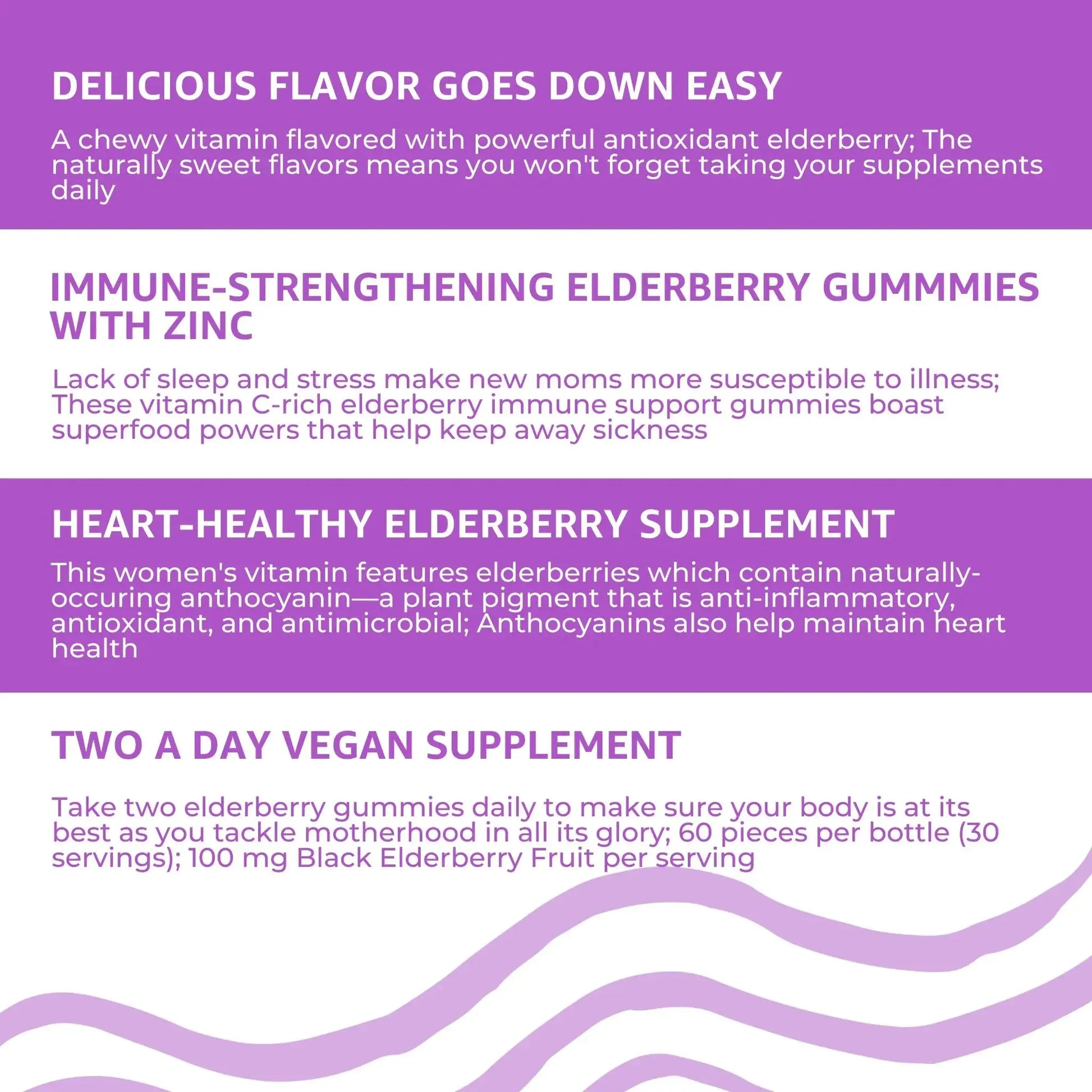Each elderberry vitamin gummy is vegan, gluten-free, non-GMO, and gelatin-free, making them perfect for new moms and adults alike. Take daily as part of your wellness routine — your immune system will thank you!