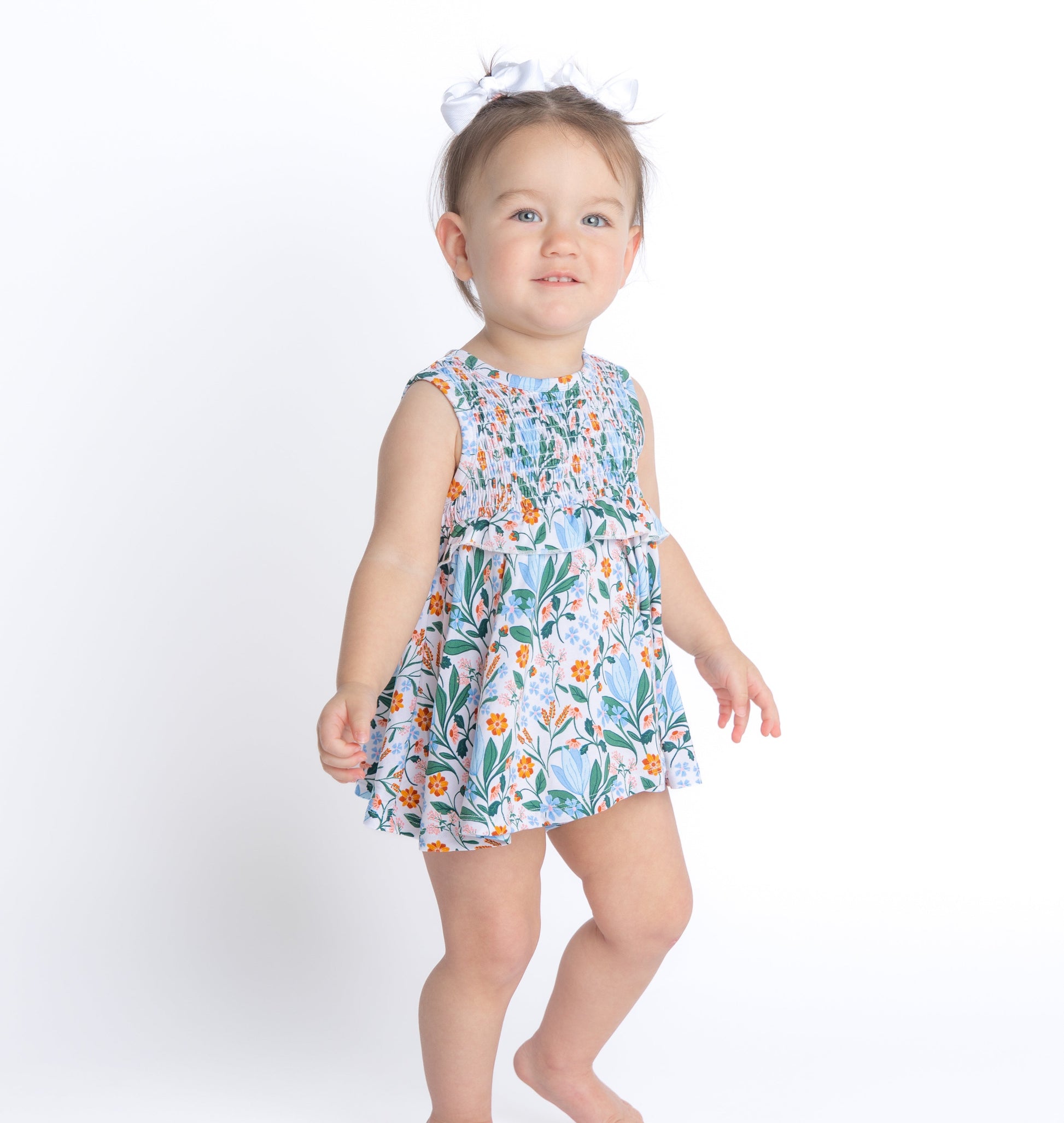Welcome spring with our bamboo skirted bodysuit in the Eleanor floral print, featuring soft pink and blue flowers. This smocked design adds a sweet, classic touch, while the breathable bamboo fabric ensures all-day comfort. Perfect for Easter or any spring occasion, this baby bodysuit combines style and functionality with a built-in skirt and easy diaper access. A must-have for your little oneโs wardrobe!