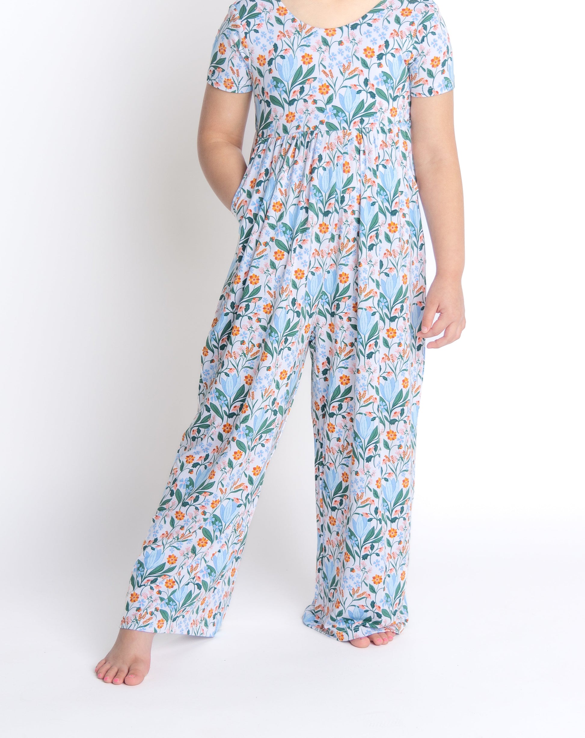 Our bamboo jumper for girls in the Eleanor floral print is perfect for spring and Easter! Featuring a delicate pattern of soft pink and blue flowers, this breathable bamboo jumpsuit offers all-day comfort and style. Designed with little ones in mind, it’s lightweight, stretchy, and perfect for playtime or lounging. A must-have for your girl’s spring wardrobe!