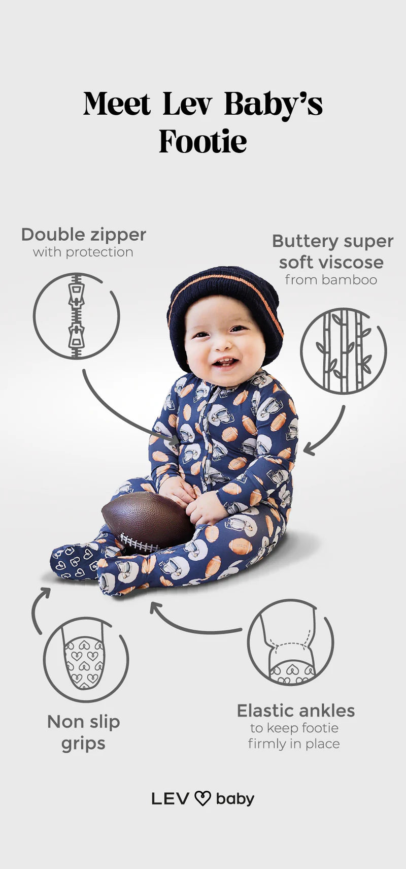 Lev Baby’s signature viscose from bamboo footie will be your favorite go-to. Dreamed up with functionality and style in mind, our bamboo viscose footie keeps your littles snug and cozy both day and night, in any season! This footie can be adorable jammies or your babe's outfit for the day! The double zipper option makes diaper changes simple at all times of the day (and night). Zip from top or bottom without undressing your babe. Footie grips in Lev's signature hearts, cuffs on newborn and 0-3M to avoid scratching their sweet faces and our snug fit will ensure the best dressed and most snuggly babe ever! Made from bamboo fibers, our fabric wicks moisture and regulates temperature, making it the perfect choice for kiddos with sensitive skin.
