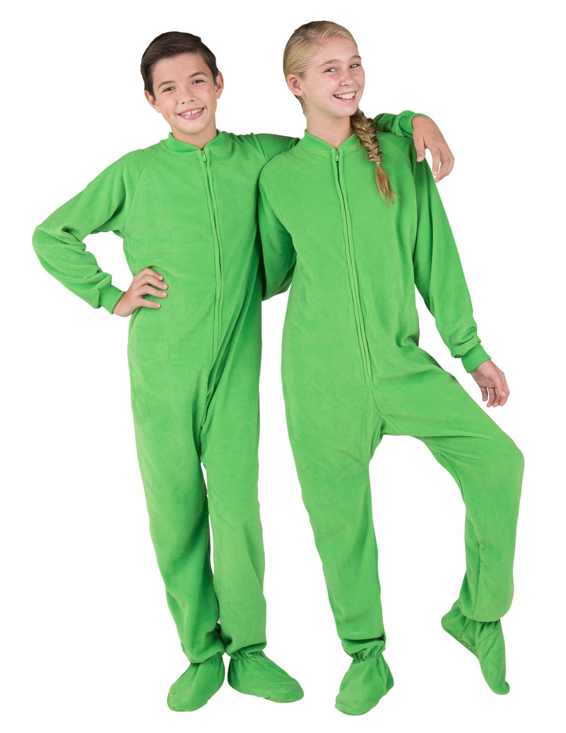 Hop into these cozy kids Kermit colored onesies and find both fun and comfort! Perfect for relaxing on a chilly morning, sleeping wrapped in softness through the night, or adding your own touches for creative costumes! Perfectly brushed polar fleece gives a blanket feel to these green footie pj’s for girls and boys.