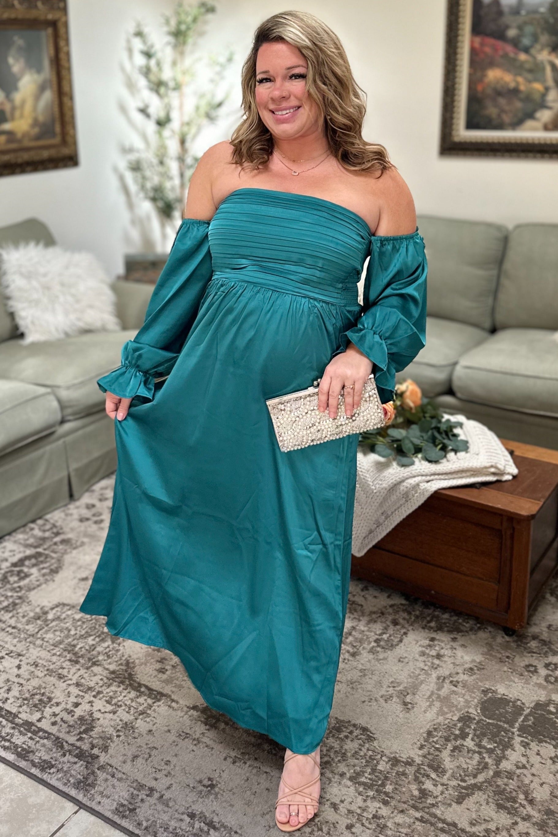 Elevate your elegance with our Emerald Green Off Shoulder Satin Maxi Dress. Featuring a chic pleated bodice that beautifully contours the neckline, this dress combines classic sophistication with a modern twist. The luxurious satin fabric offers a smooth, shiny finish that catches the light as you move, while the off-shoulder design and voluminous long sleeves add a touch of romantic flair. Perfect for formal events, weddings, or evening occasions, this maxi dress flows effortlessly to the floor, creating a stunning silhouette. Pair with your favorite heels and delicate jewelry for an unforgettable look.