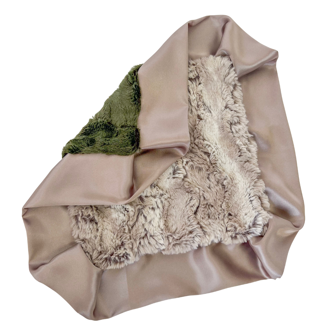 Introducing our exclusive Enchanted Forest Luxury Lovie, a miniature masterpiece of comfort and style. This exceptional lovie blanket is meticulously crafted using 100% polyester faux fur cuddle, offering unmatched softness and warmth for your little one.