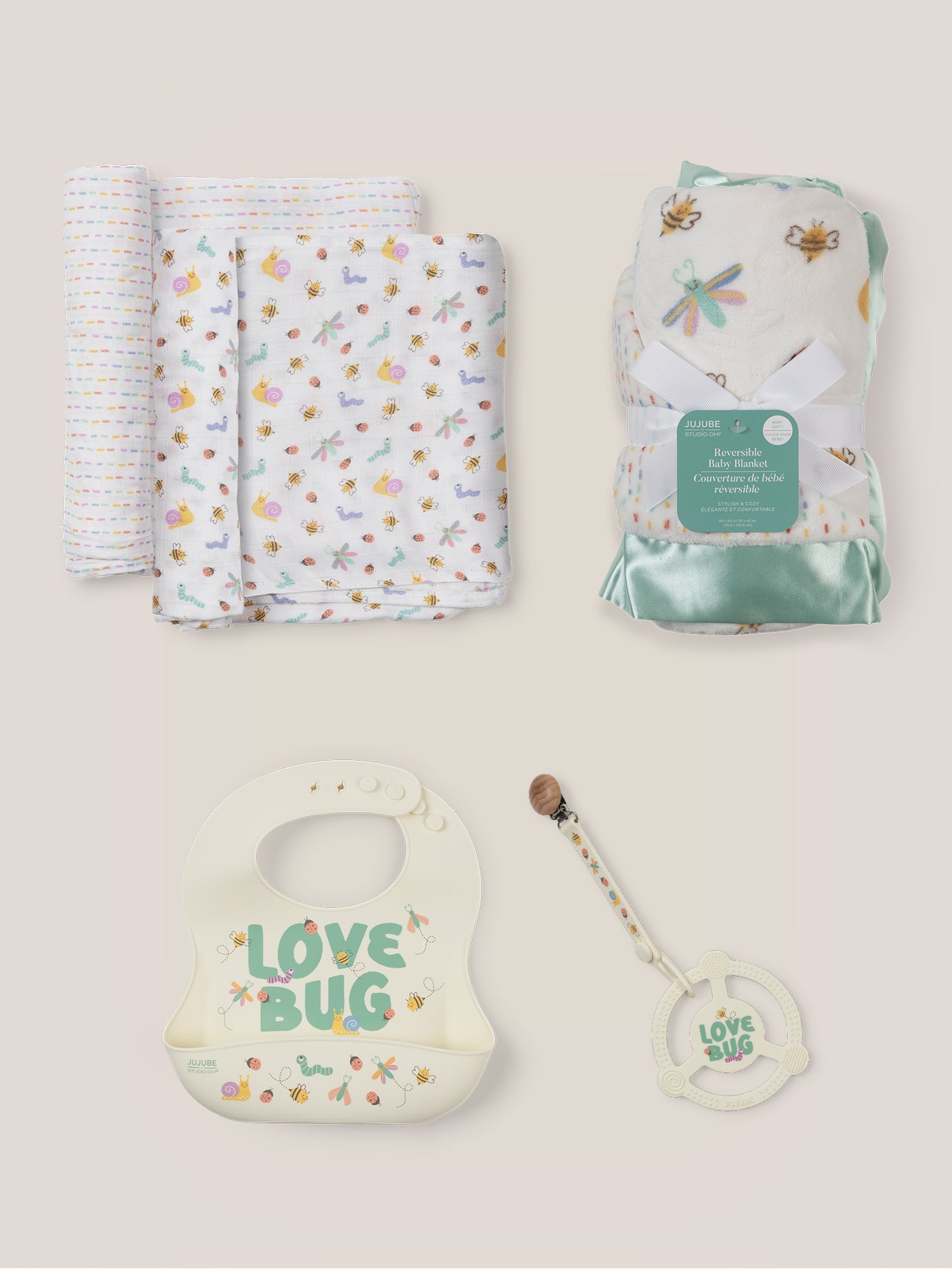 This delightful assortment of baby essentials from JuJuBe × Studio Oh! showcases adorable, lovable bugs that will have Baby buzzing with joy! From socks and bibs to blankets and teethers, it’s the perfect everyday bundle that's both fun and functional.