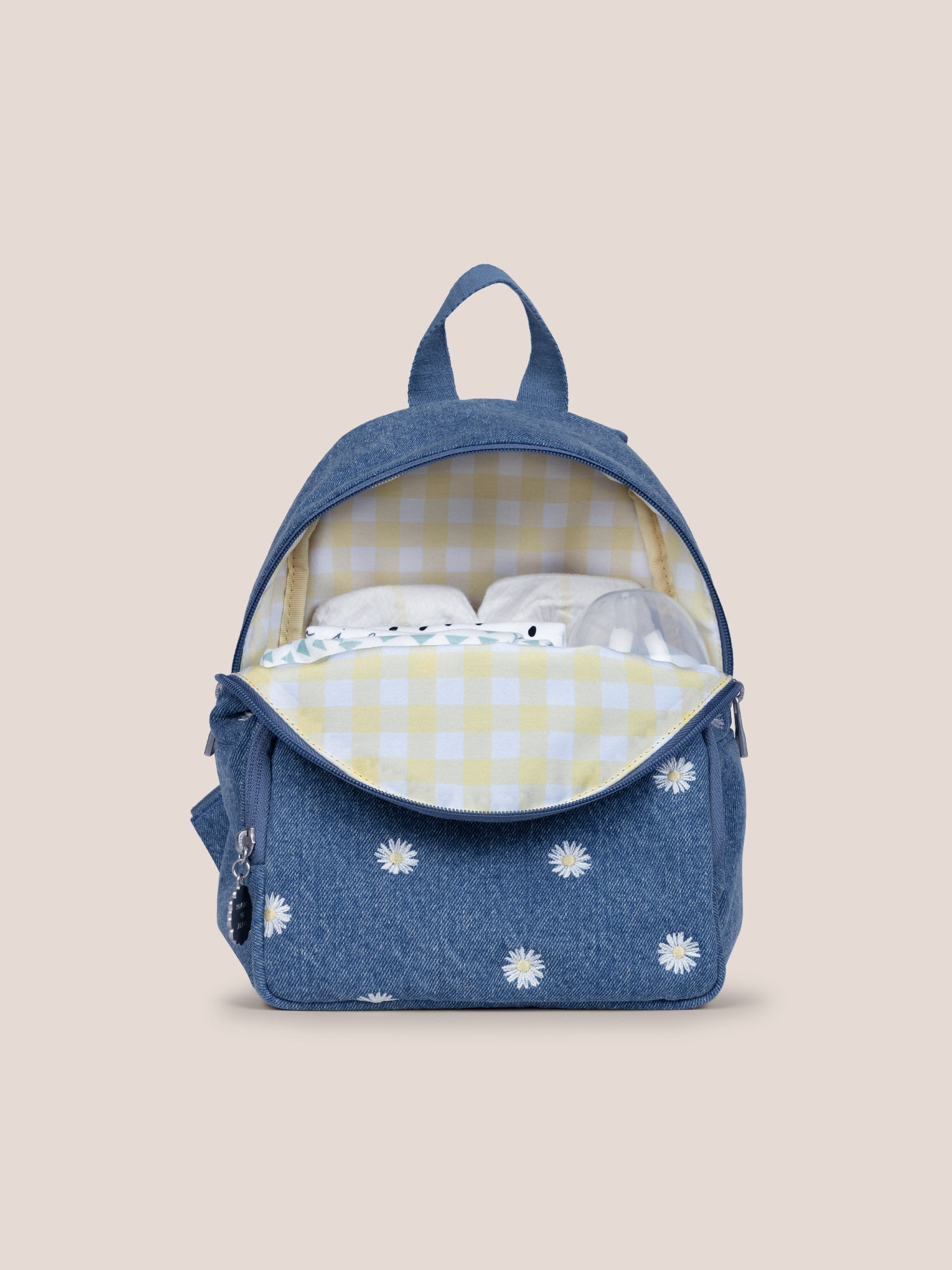 Small but mighty, this charming mini backpack is as cute as it is functional! It's made with a 100% cotton exterior that showcases a light blue denim, embroidered daisies and, and a cheerful yellow gingham lining for an extra pop of cheer. Thoughtfully designed, it features interior bottle pockets that fit two baby bottles or water bottles, a padded back slip pocket for a small tablet or changing pad, and a zippered front pocket for wipes or a phone. A small interior pocket keeps keys and other valuables secure, while the spacious main compartment is ideal for everyday essentials, including JuJuBe’s 3-Piece Pouch Set. Padded, adjustable straps and a cushioned back panel ensure all-day comfort, and a special silver daisy zipper pull adds an extra dash of charm.