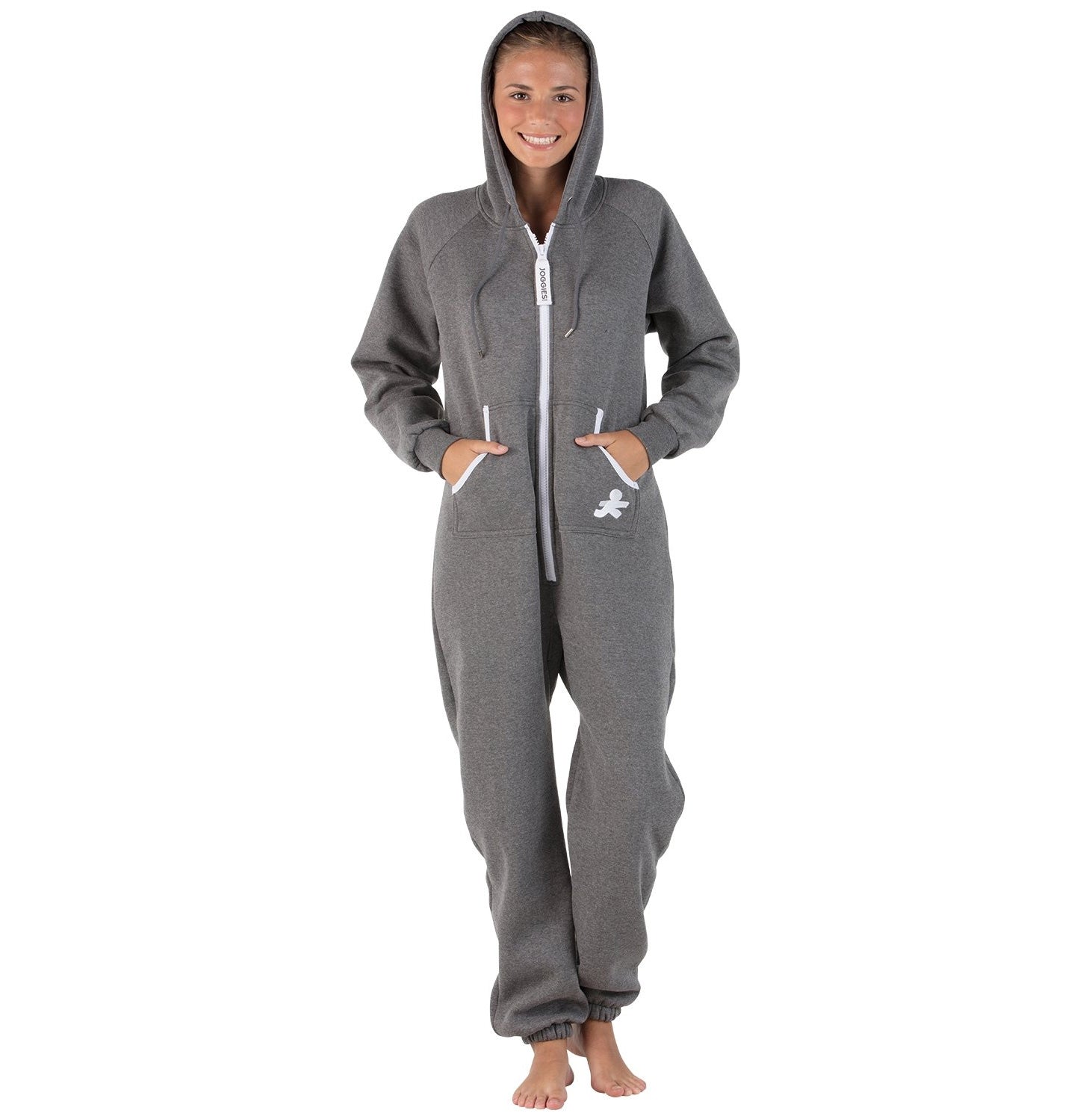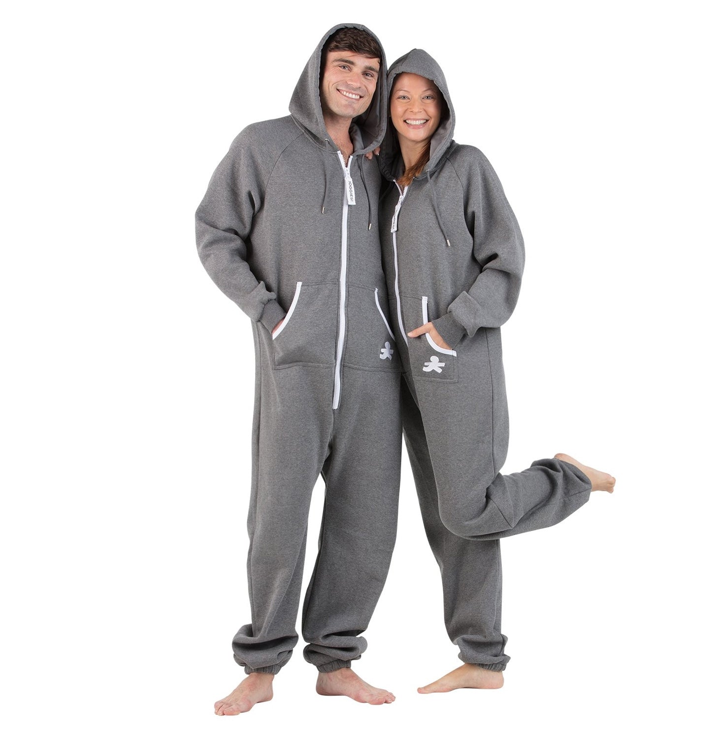 Joggies are the perfect mix between a sweat suit and one piece pajamas! Hoodies and pockets make them stylish and thick sweatshirt fleece makes them ultra-cozy! Ideal for walking the dog on the chilly mornings, enjoying a bonfire while camping, and for sleeping in, too! Roll out of bed ready for the day! Women and men, boys and girls will love and look gorgeous in gray! And an inclusive size chart makes these the best plus size onesie jogging suits!