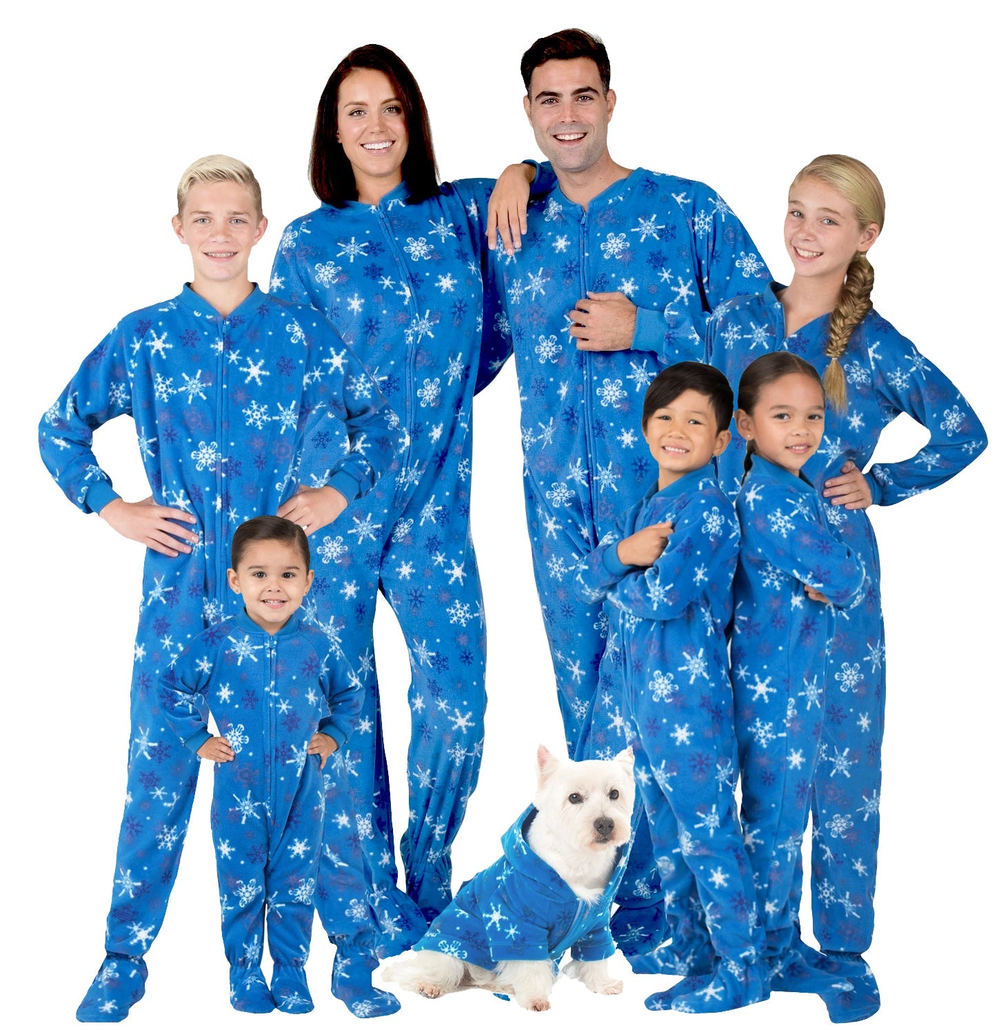 White, blue and grey snowflakes dance around and fall over these winter blue footie pajamas for men and women, boys and girls. Ultra-cozy, soft polar fleece warms bodies and spirits on even the coldest and chilliest of days. Relax and lounge, or sleep wrapped up in amazingly comfortable hoodie one piece pajamas.