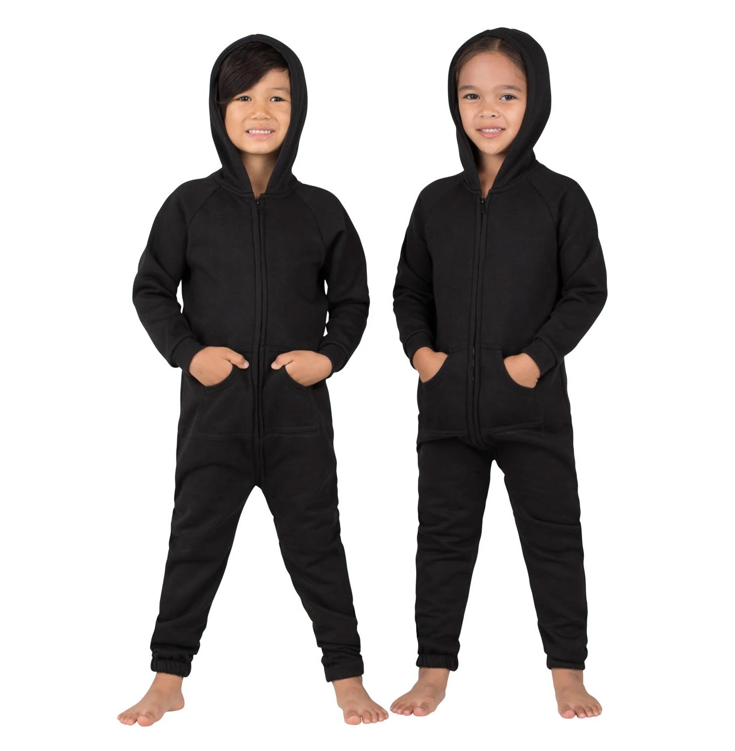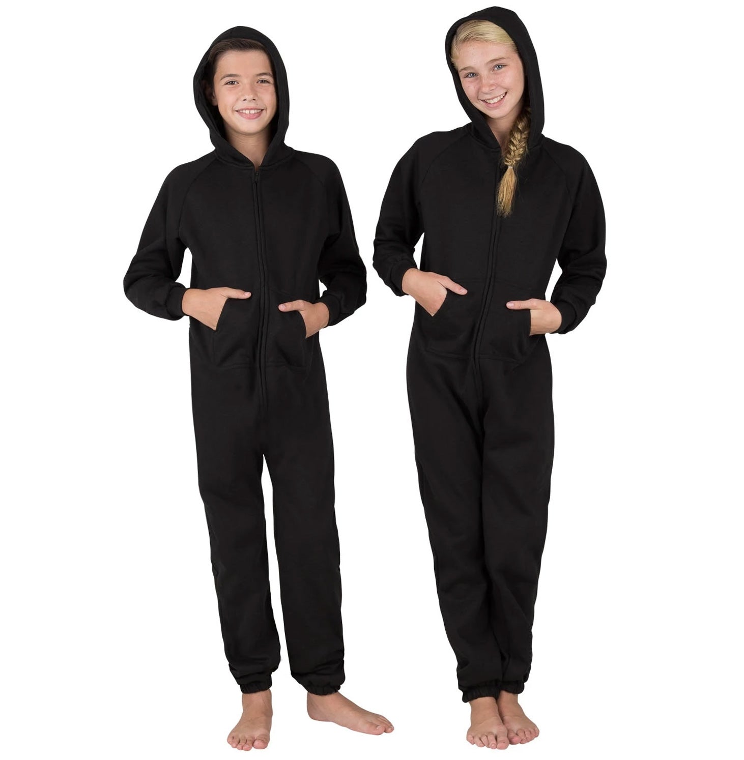 The perfect mix between a track suit and one piece pajamas! Sweat shirt fleece with hoodie’s and front pockets make these joggers extra stylish! Roll out of bed ready for the day! Great for sleeping in and as laid-back outerwear! Women, men, boys and girls will love and look gorgeous in these black footless onesie’s for the whole family.
