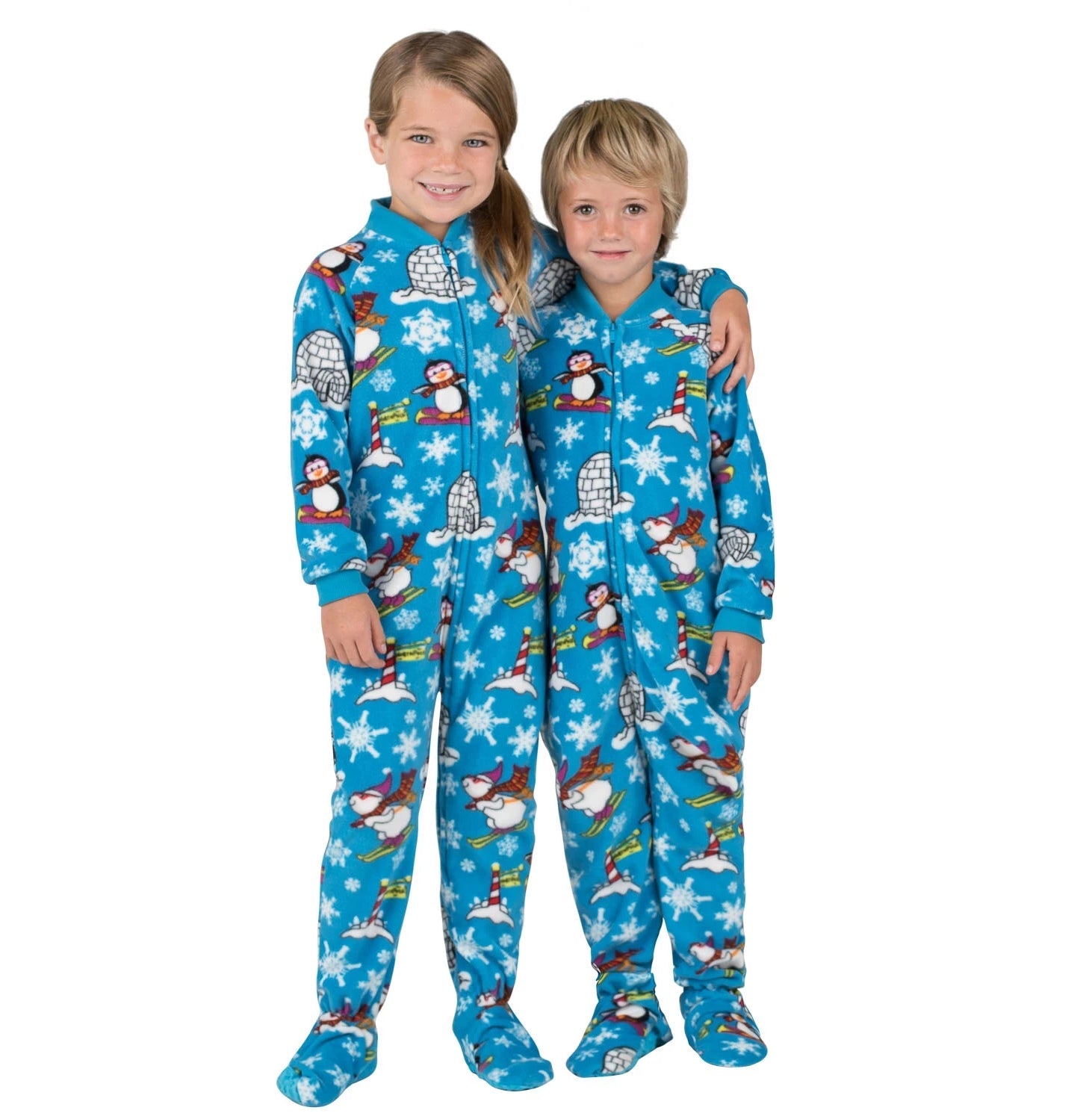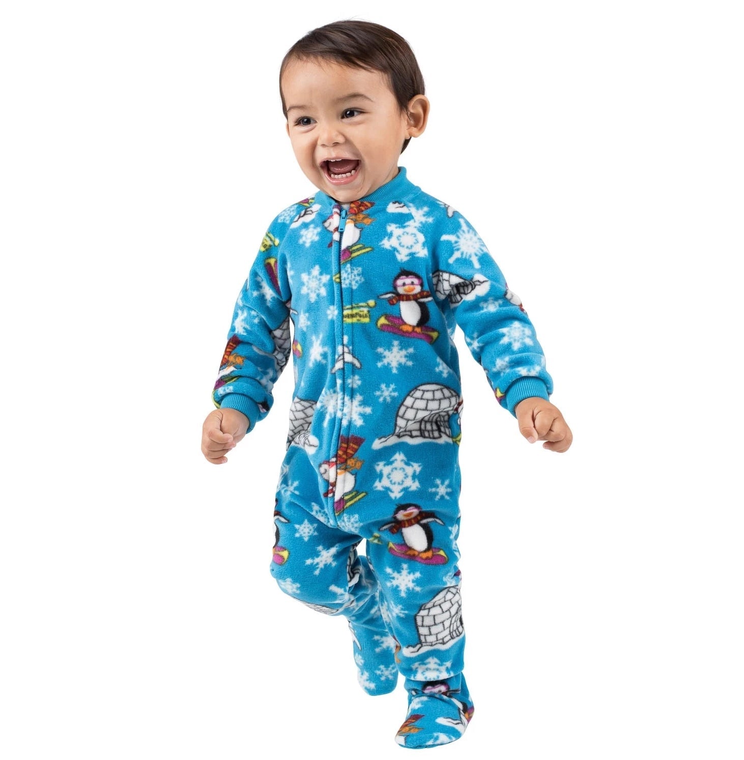Winter wonders abound in these whimsical feel good footie pajamas for men and women! Polar bears ski and penguins snowboard past igloos and the North Pole sign during a blizzard as snowflakes fall with fury! Soft and durable polar fleece will bring comfort and last all season long! Features include front pockets and hoodie. High quality, durable and fun!