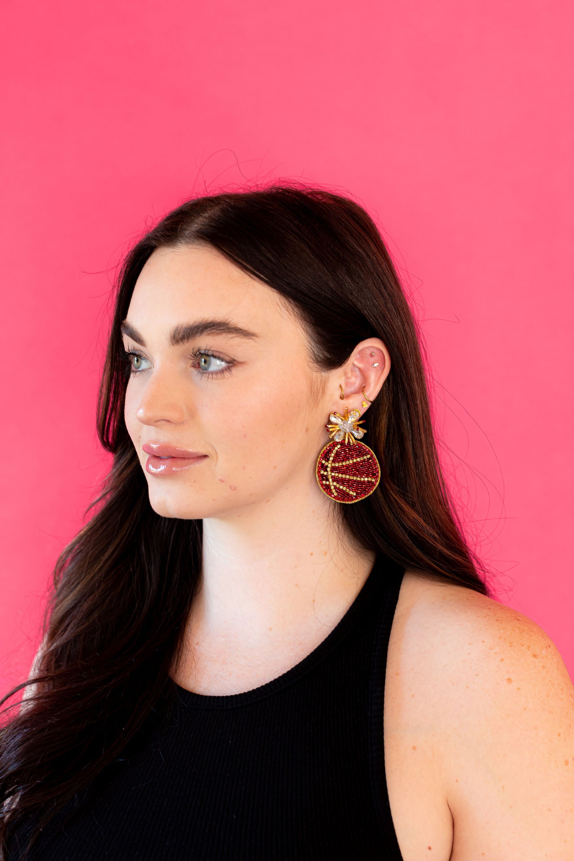Sparkle and Shine at the basketball court with our Fancy Basketball Earrings. Embellished with rhinestone and seed bead detail.