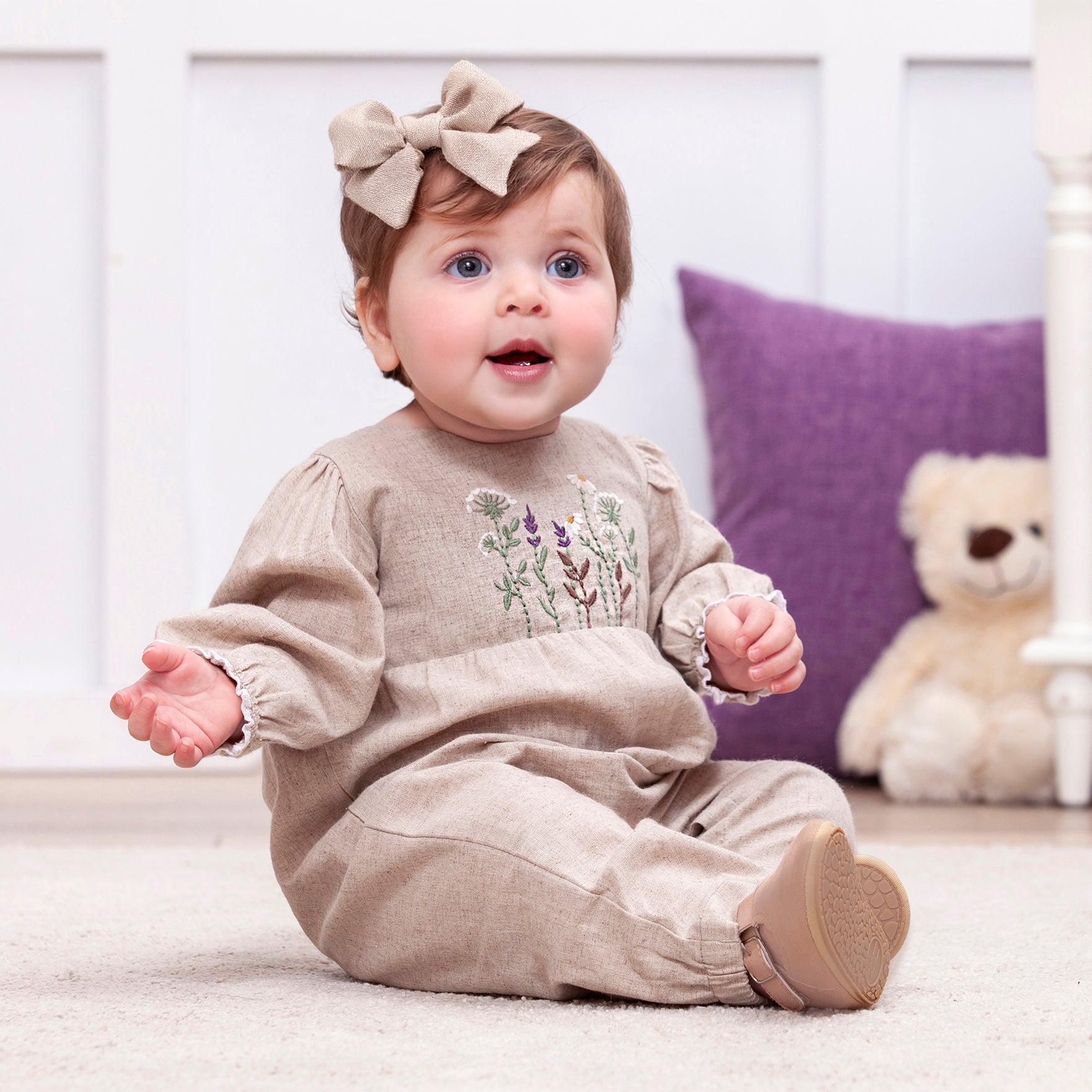Embroidered Linen-Blend Baby Romper–Vintage Style