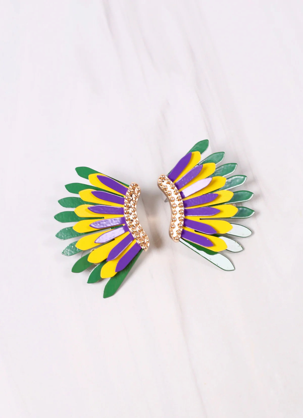 This metal fan earring is so trendy. It has purple, yellow, and green accents to pair well with your Mardi Gras outfit!