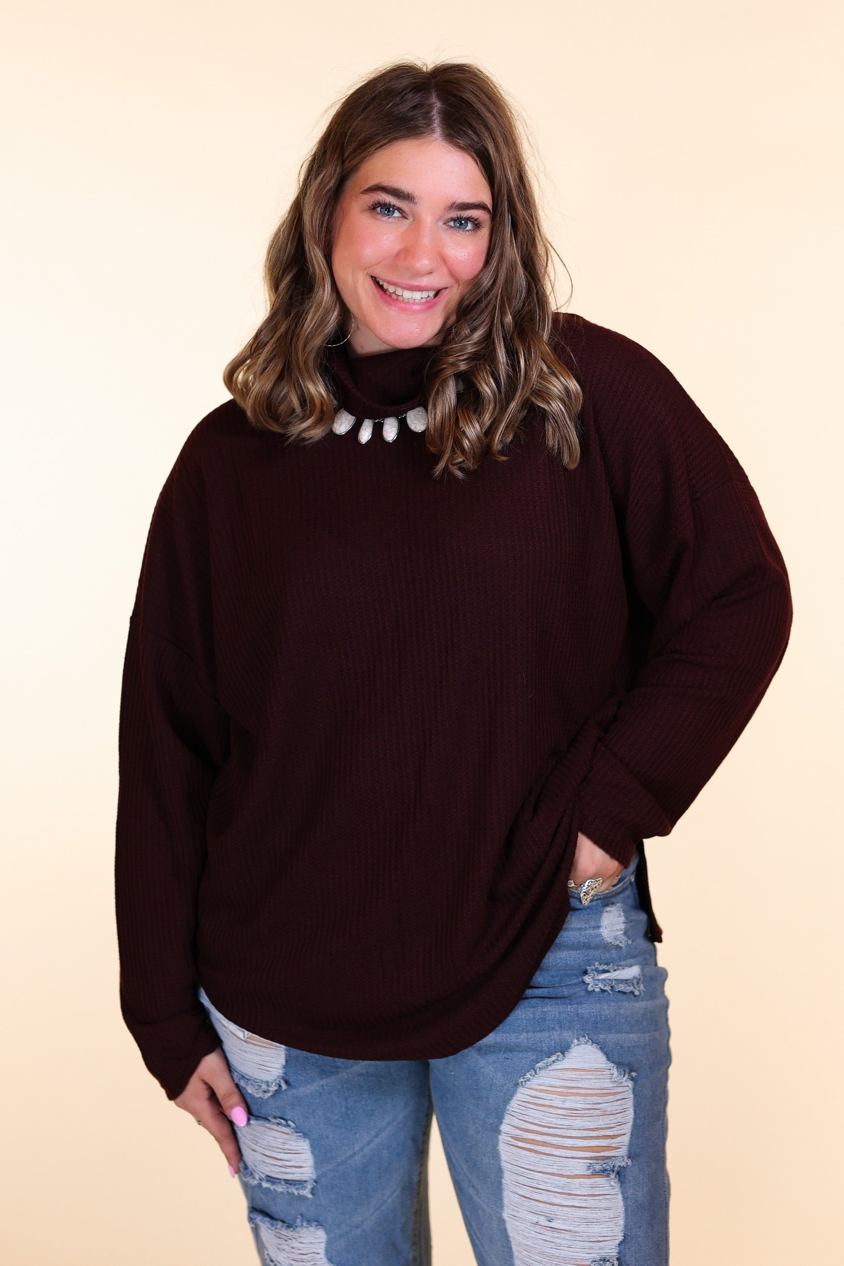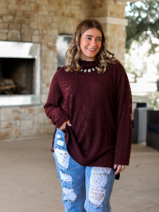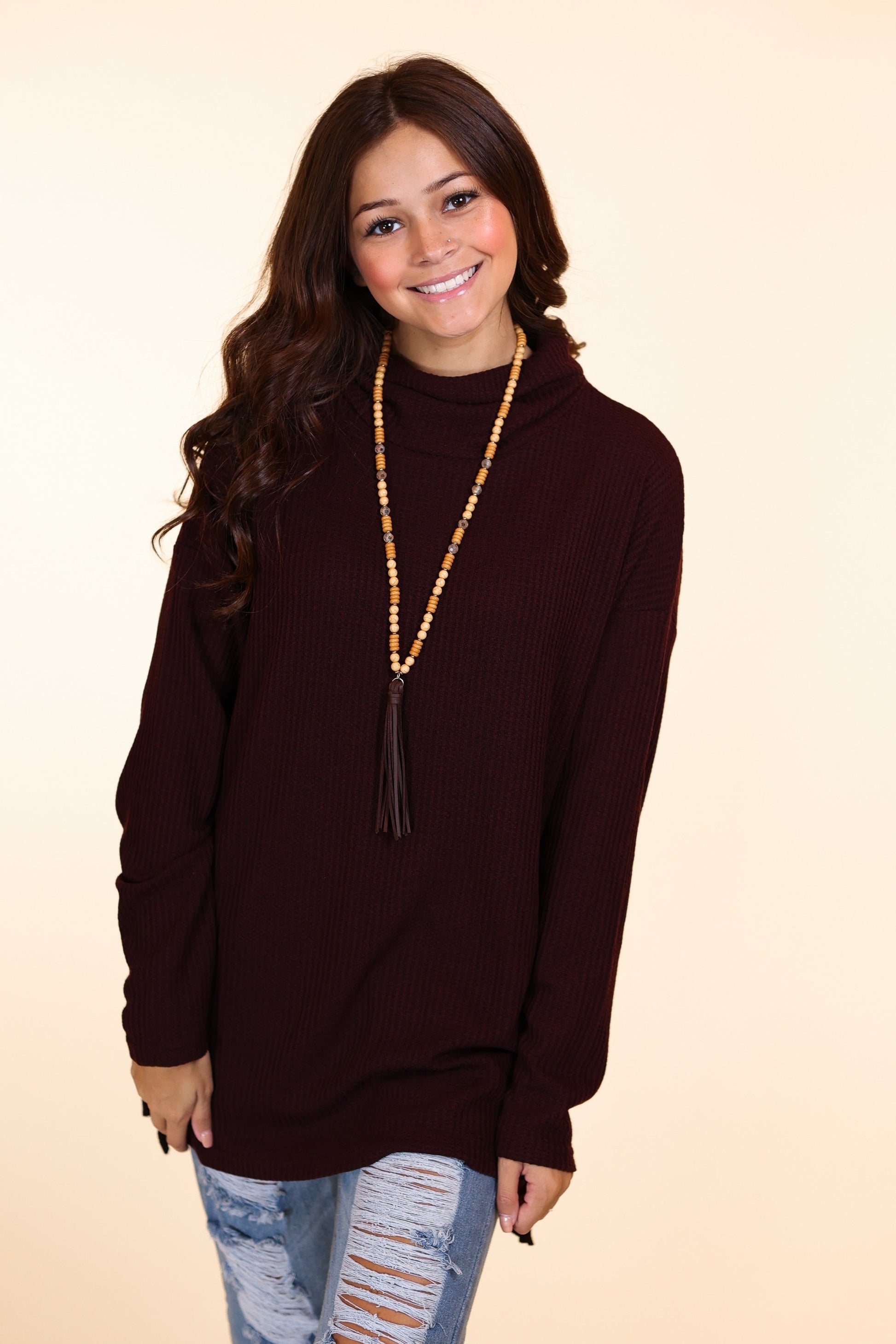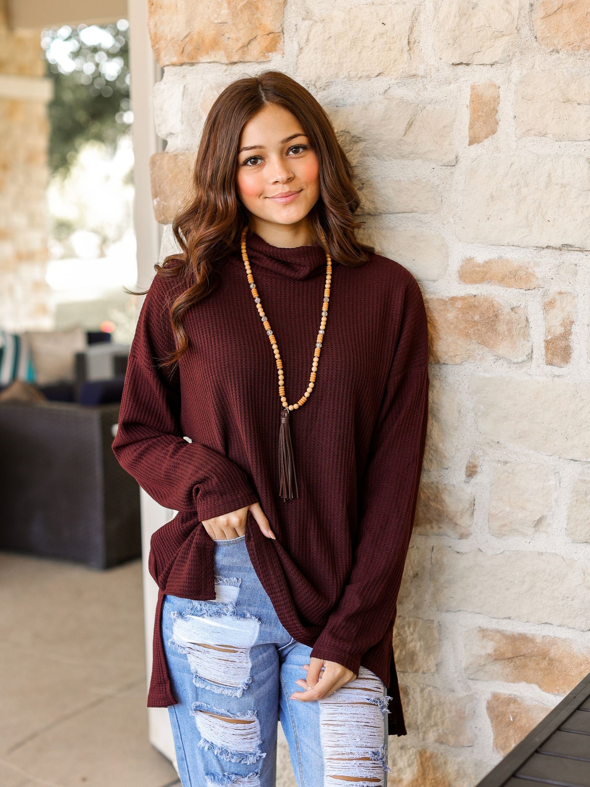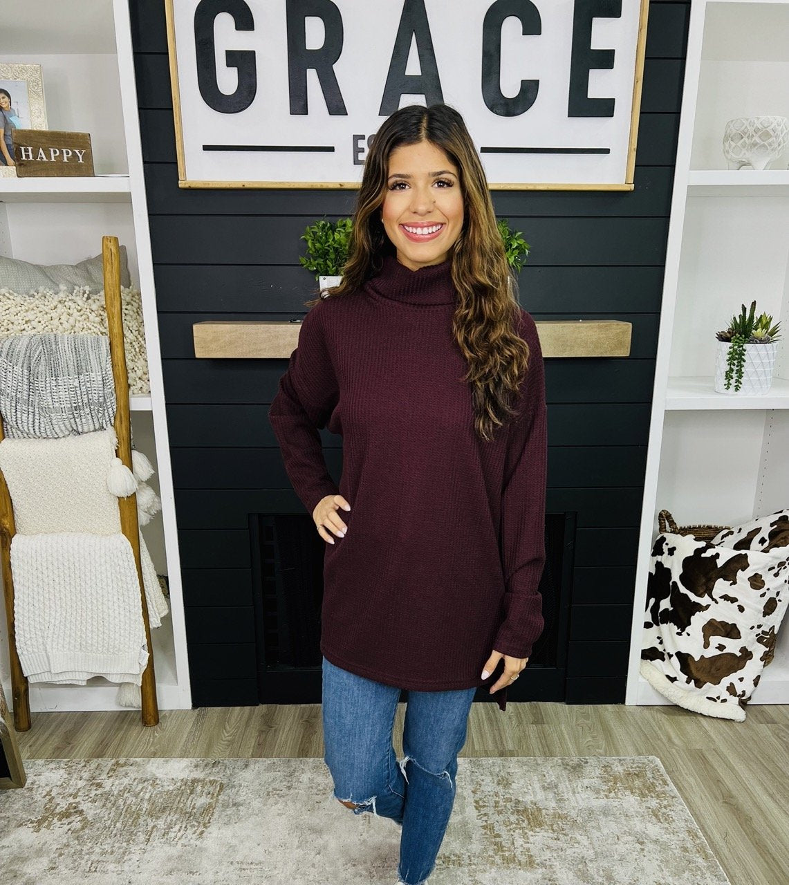 The ‘Fireside Feels' top is giving us all the cozy vibes. It has a turtleneck, tunic-style fit, and a rounded hem. Pair it with leggings for a trip to the farmer's market or movie theater!